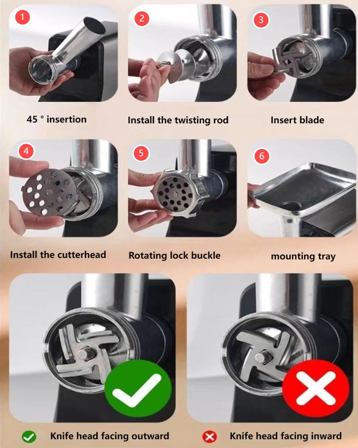 Easy to clean – The cutting accessories of the meat grinder are designed to be detachable for easy cleaning and cleansing. Caution: Do not put them in the dishwasher