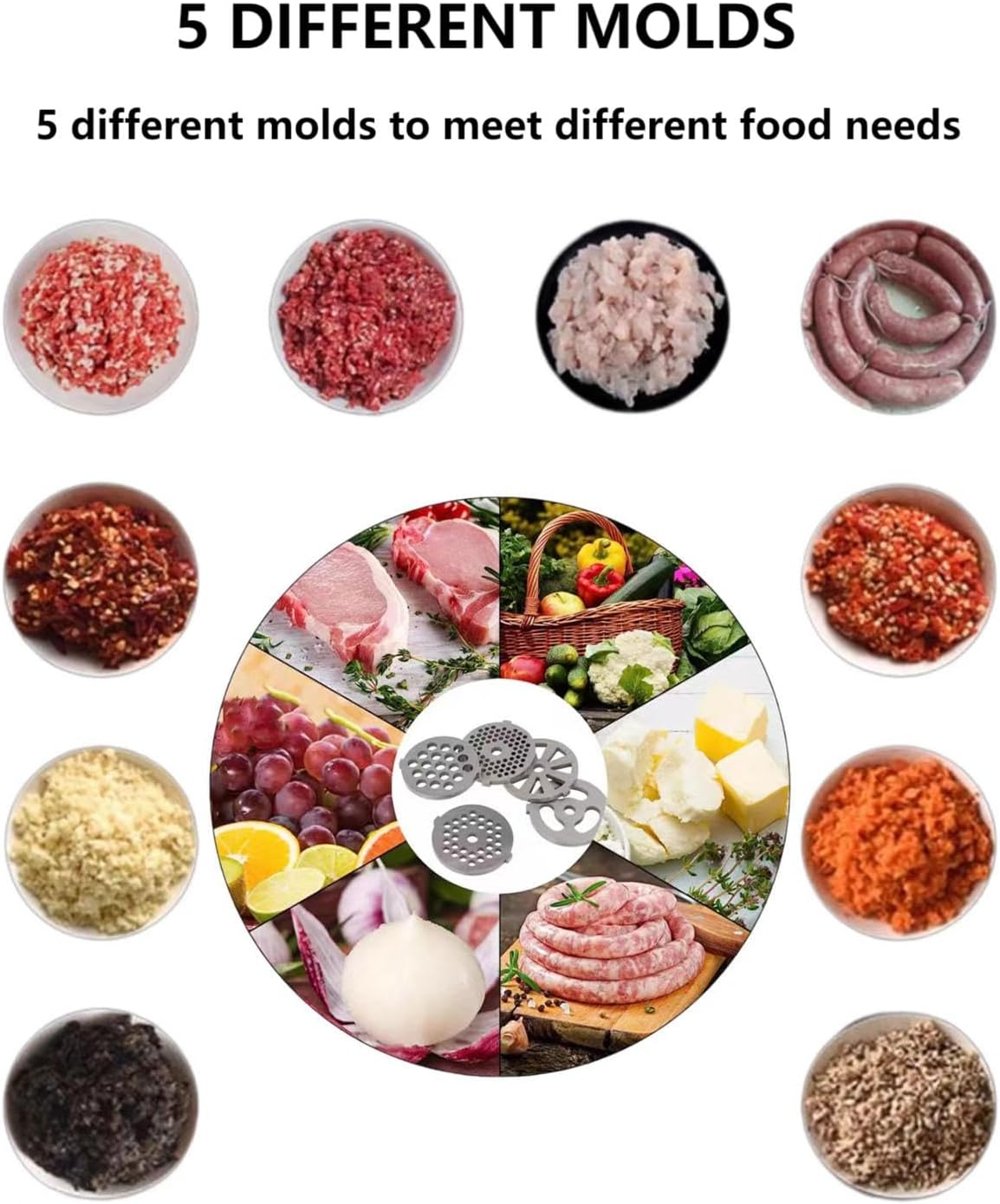 Control the quality of minced meat – The heavy-duty meat grinder comes with 5 grinding plates (2mm/5mm/7mm/fan-shaped/large three hole) and 2 sizes of sausage filling tubes to meet your daily needs. Two sharp stainless steel cutting blades make it easy to cut minced meat, making it simple and practical