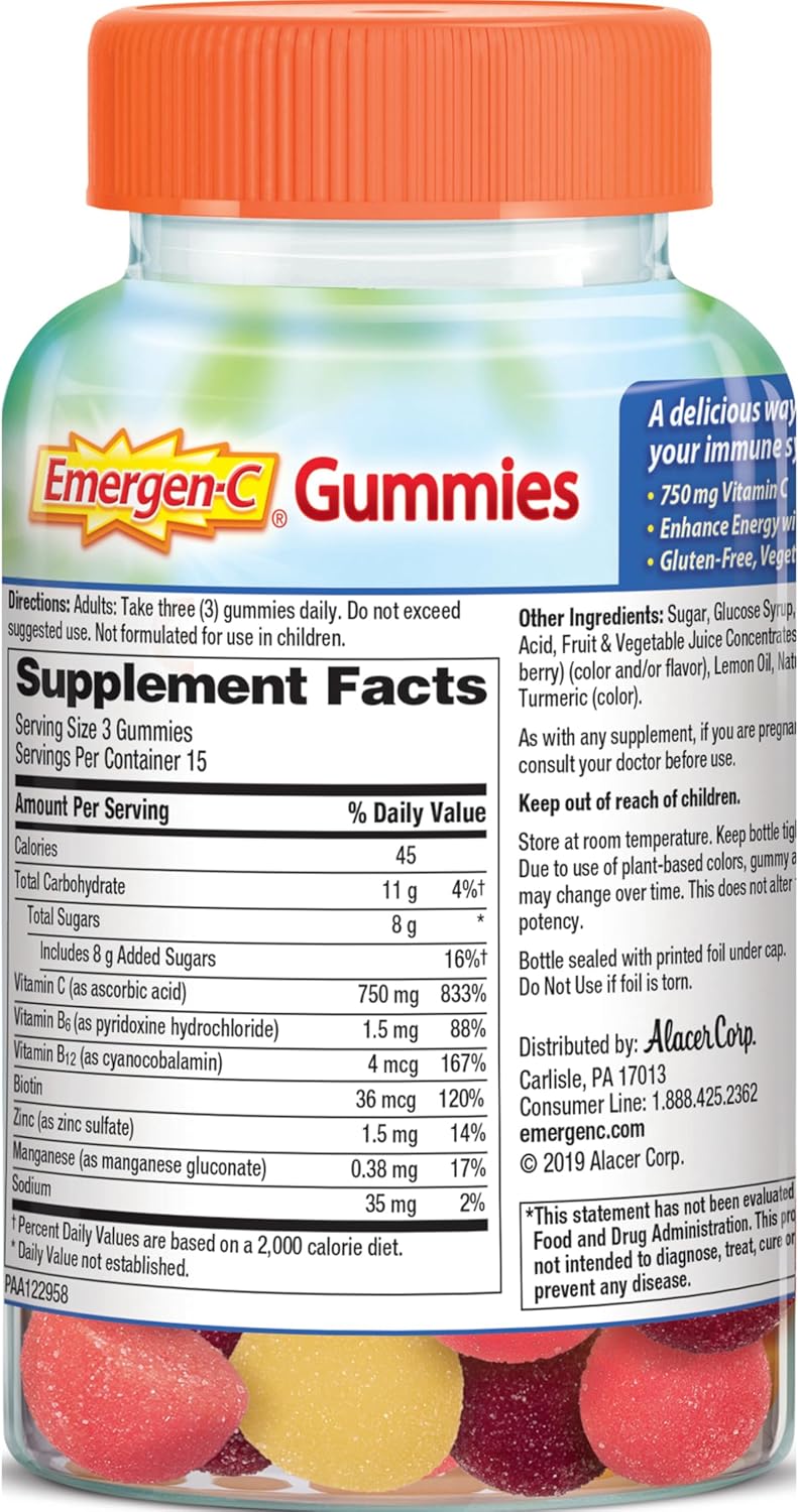 Emergen-C 750mg Vitamin C Gummies for Adults, Immune Support Gummies, Gluten Free, Strawberry, Lemon and Blueberry Flavors – 45 Count