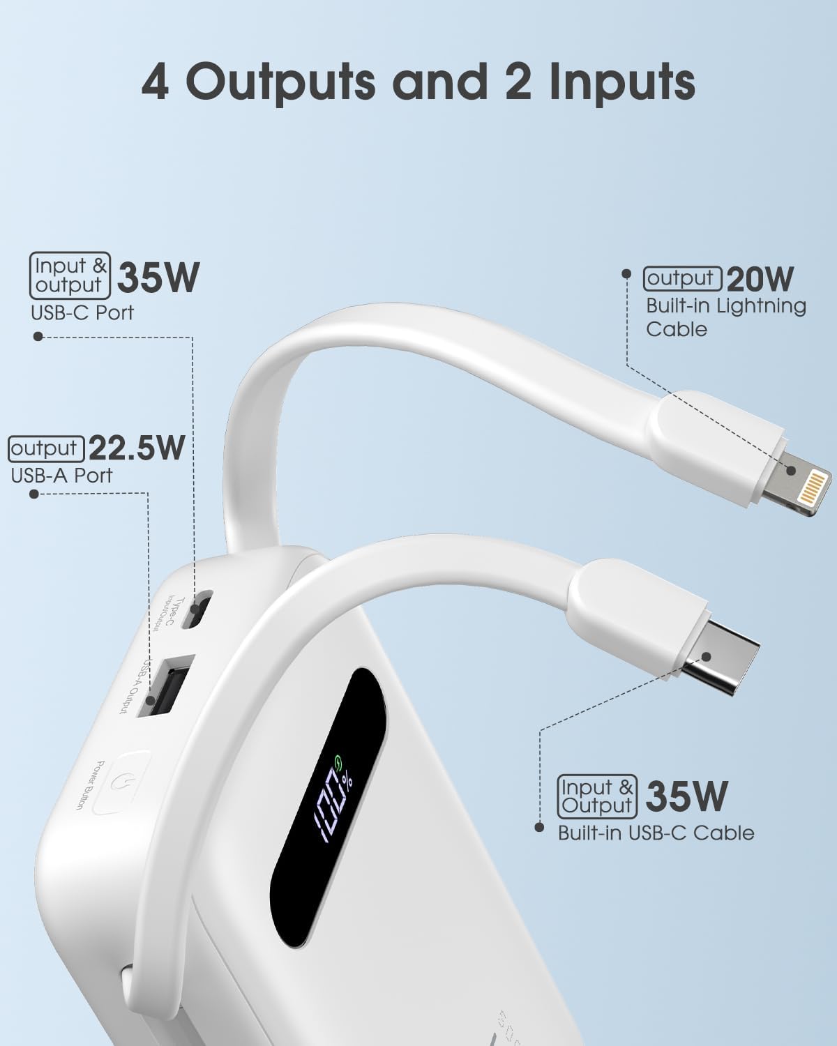 Built-in 2 Cables & 4-Port Charging : One Portable Charger for All Your Needs! Power up 4 devices at once via the Built-in USB-C IN/OUT cable(test for 40000+ bends) & Lightning cables, plus USB-C & USB-A ports. Compatible with iPhone, Galaxy, iPad, AirPods, and more—no extra cables needed!