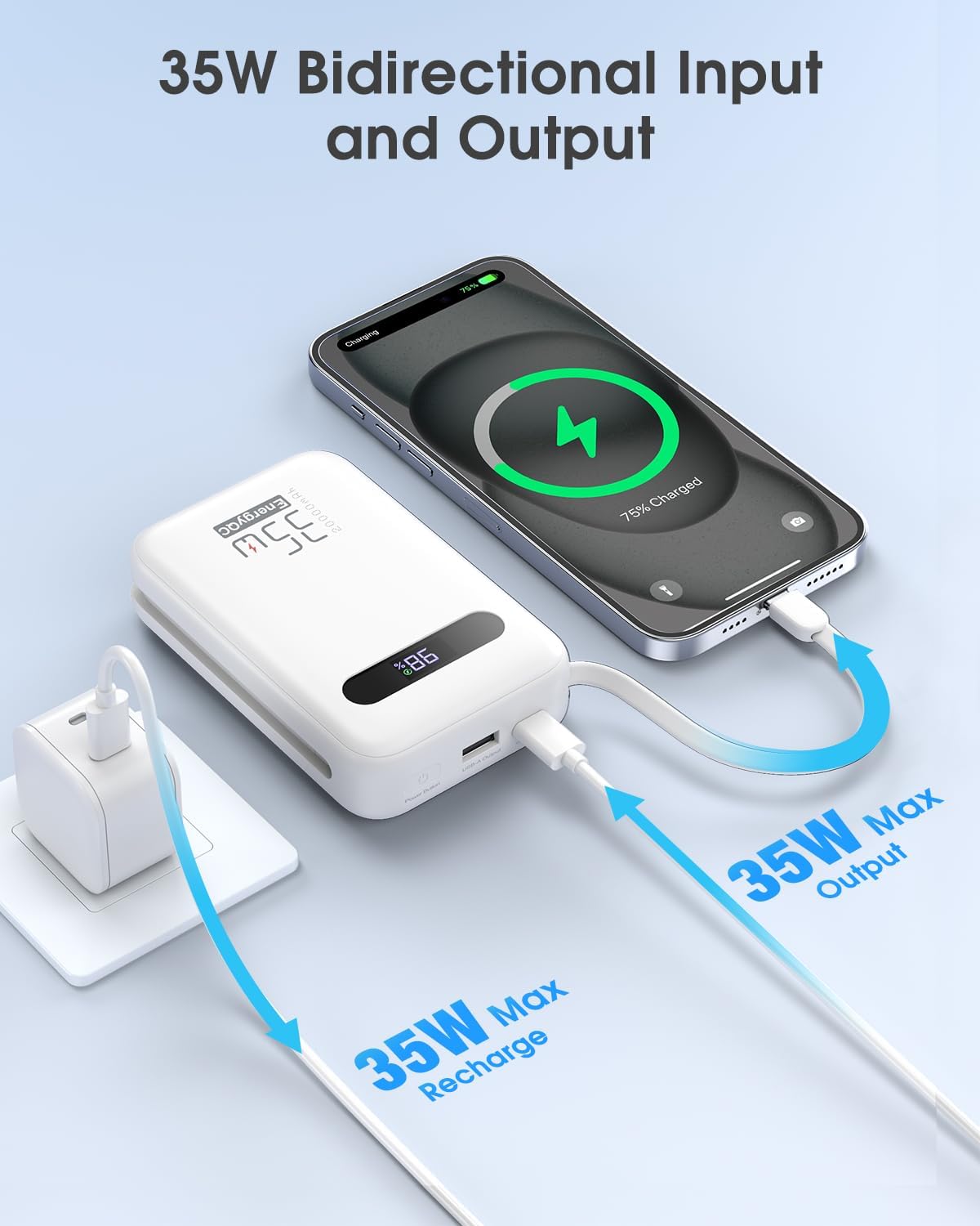 EnergyQC Power Bank, 20,000mAh 35W PD 3.0+QC 4.0 Fast Charging Portable Charger with Built-in Lightning & USB-C in&Out Cables, Battery Pack for iPhone 16/15/14 Series, Galaxy, iPad, AirPods, White