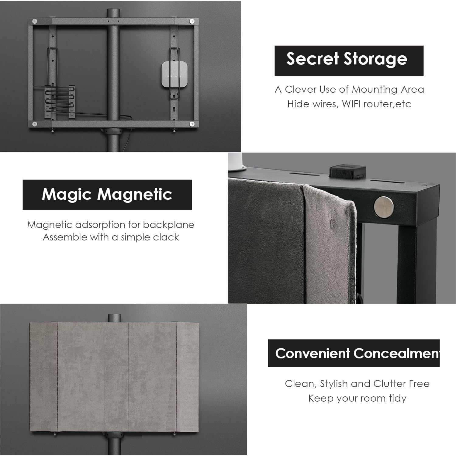 Secret storage area for wires. A clever mounting area to hide wires,wifi router,etc