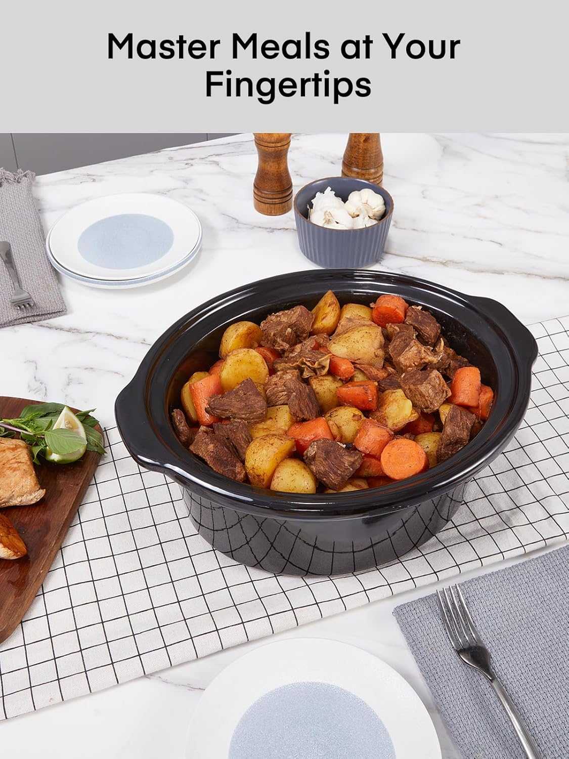 Set and Cook: This state-of-the-art slow cooker with a sleek digital panel. Effortlessly adjust cooking time and temperature to achieve perfect results every time. The innovative delay start function lets you plan meals around your busy schedule, ensuring delicious, home-cooked dishes are ready when you are. Simplify your cooking experience today!