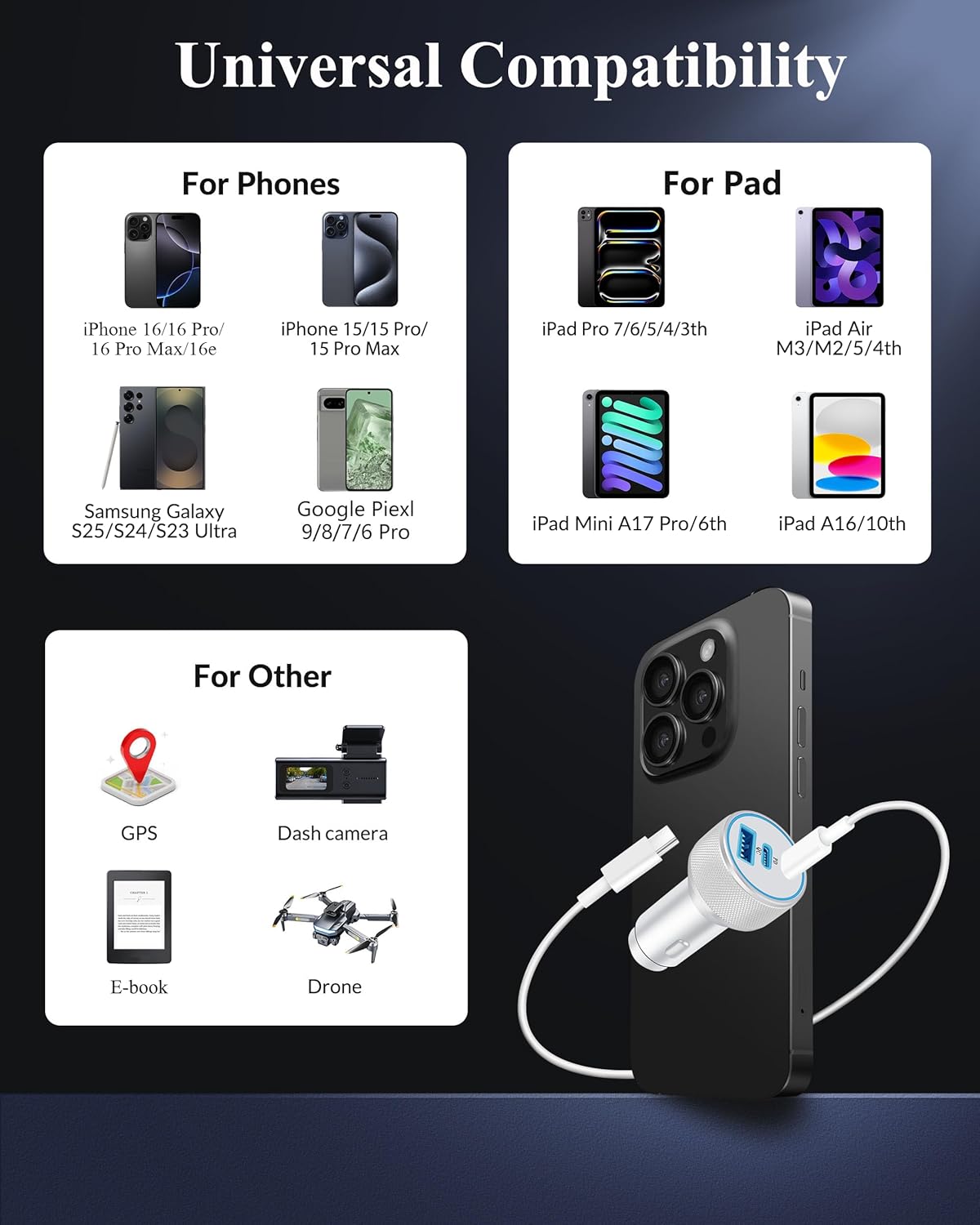 Widely Compatibility: The 67w fast car charger with 3ft usb c charge cable compatible with iPhone 16e/16/16 Plus/16 Pro/16 Pro Max/15/15 Plus/15 Pro/15 Pro Max, iPad Pro/Air/Mini, Mac Book Pro/Air, and also fast charge for Samsung, Google, LG, Android, Tablet, and more