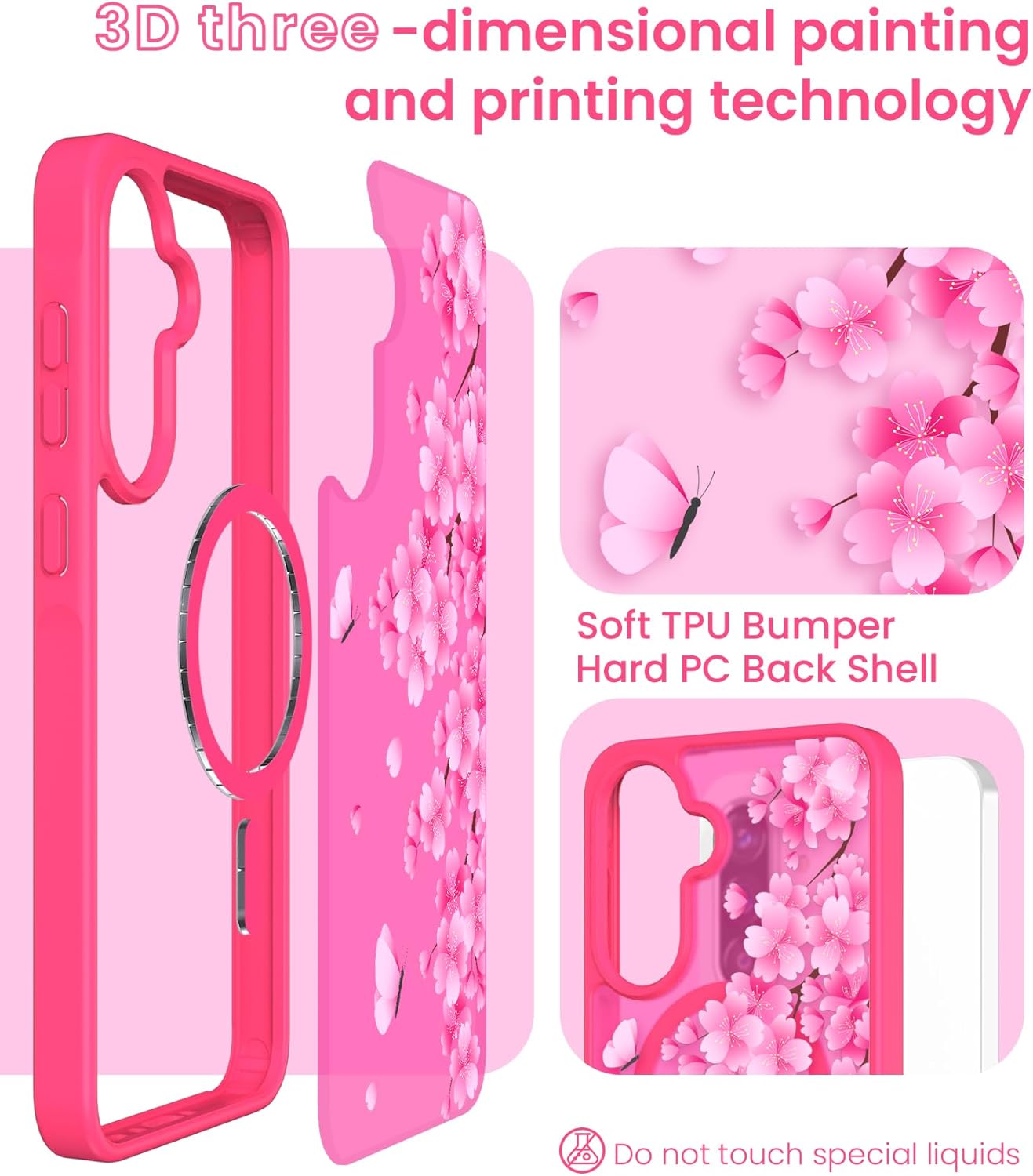 for Samsung Galaxy A36 5G Floral Phone Case with 2X Screen Protector, Military Grade Magnetic Translucent Matte Girls Women Flower Pattern Protective Cover for A36 5G (Hot Pink)