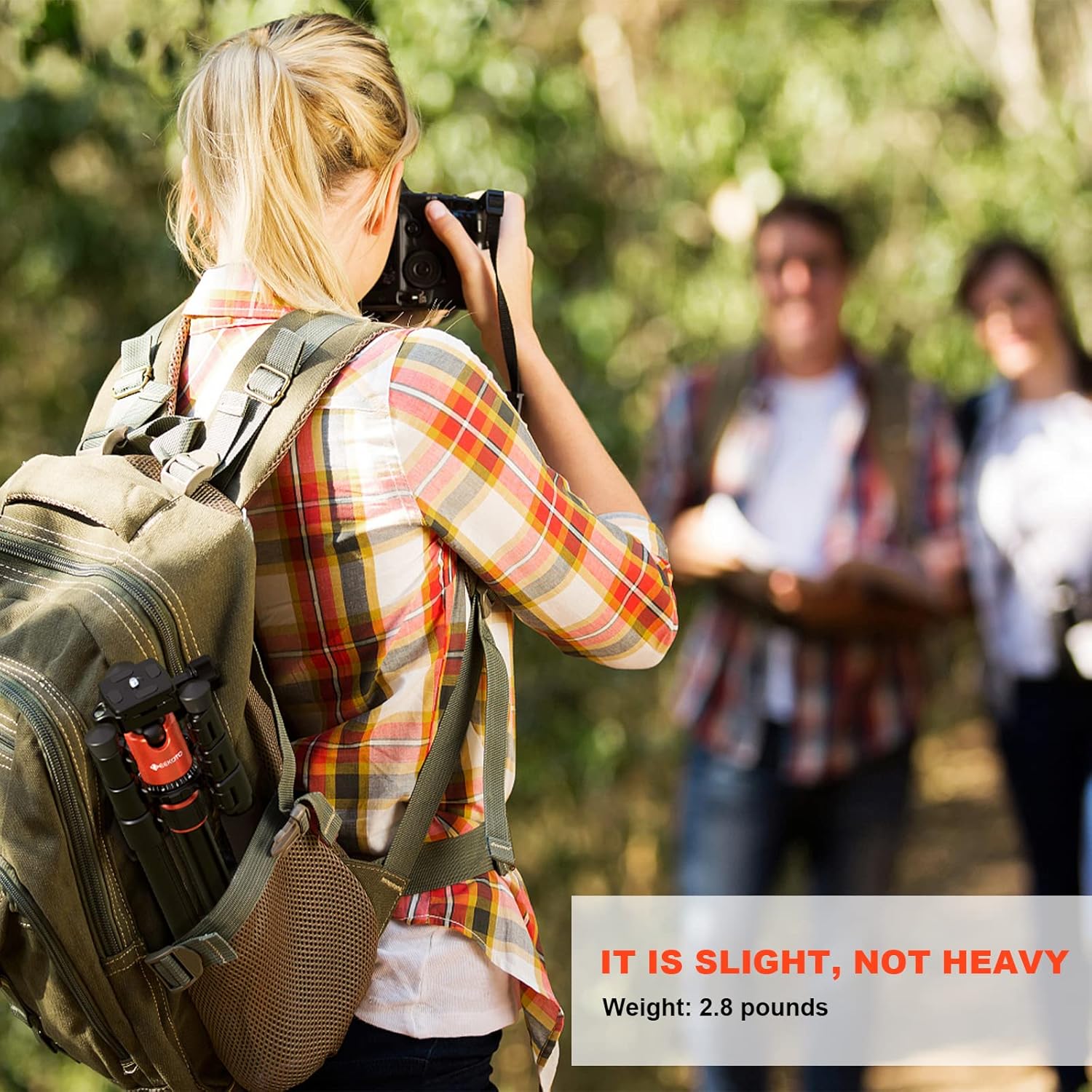 Ultra Stable and Lightweight: Aluminum alloy professional camera tripod, lightweight but sturdy, Center column design with hook for goods to increase stability, Loading Capacity : 17.6lbs/8kg. Tripod legs can be inverted and folded back 180 degrees, storage size is 14.5 inches, and weight is 2.8lbs, which is compact and easy to carry and pack for travel.