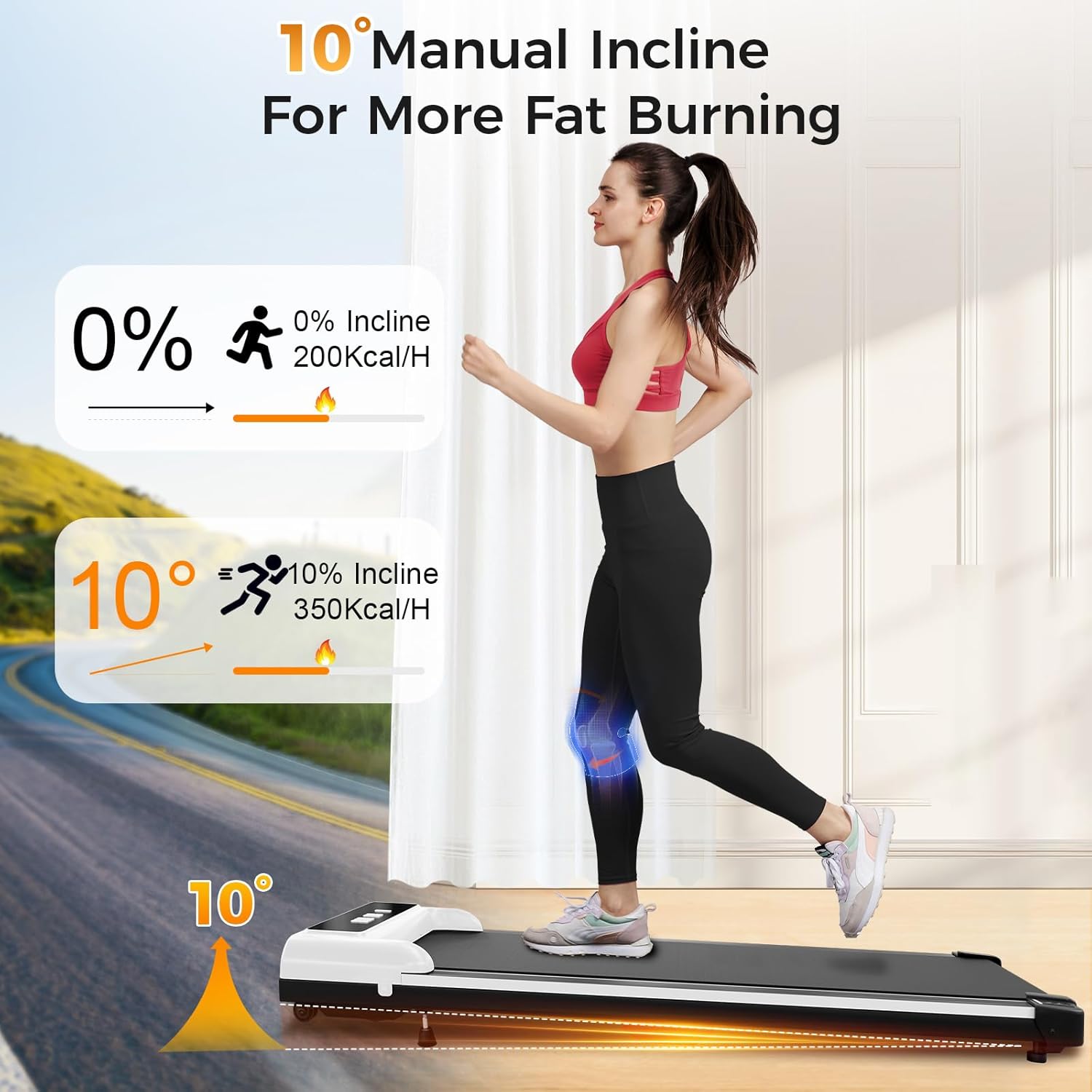 🚶[0-10° Incline, Shock Absorption, 5-Layer Non-Slip Running Belt] This foldable treadmill features a 5-layer non-slip running belt with silicone supports for knee, muscle, and ankle cushioning. The adjustable incline (0-10°) can be set using foot pads. The 40.55″ x 15.35″ belt provides shock absorption and anti-slip design for stable walking or running.