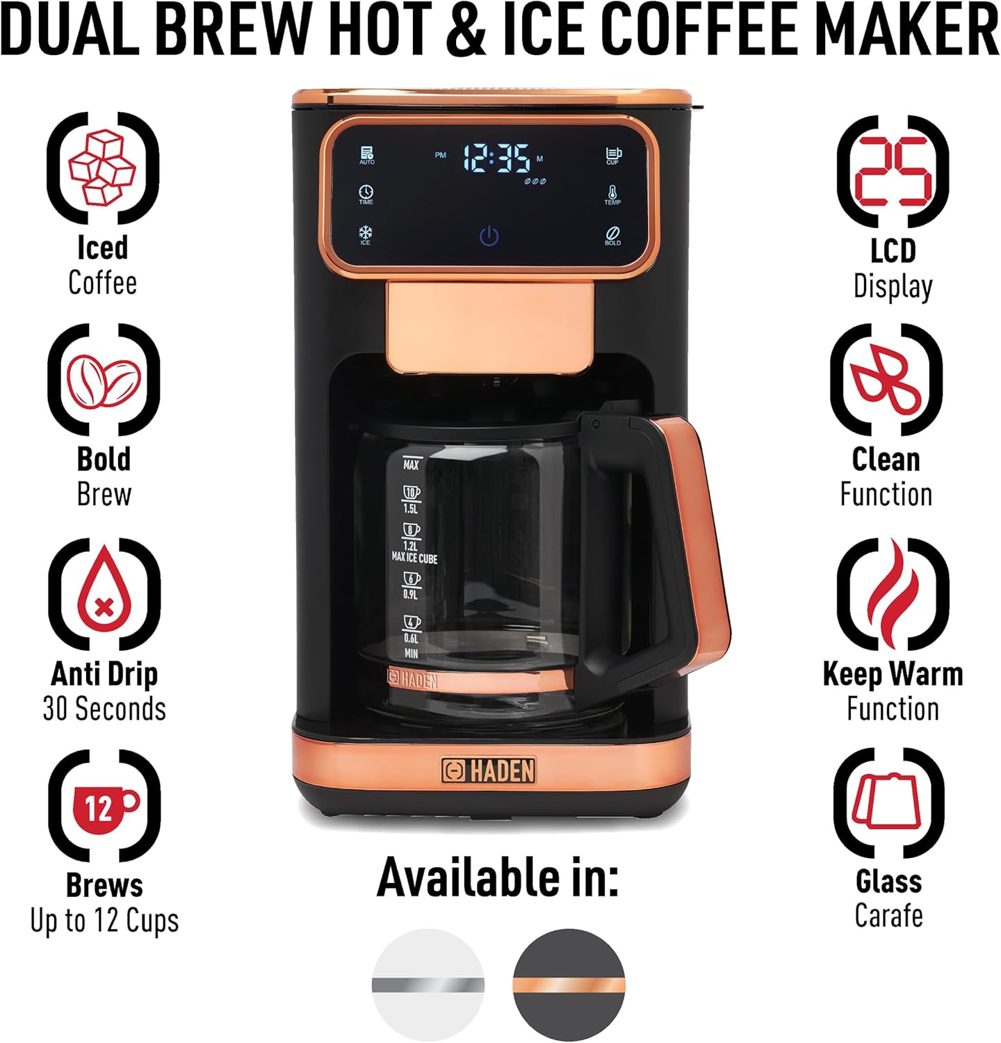Haden Dual Brew 12 Cup Hot and Iced Coffee Maker with 120 Minute Keep Warm, Delay Brew, Adjustable Strength, Programmable Clock, and Anti Drip, Black