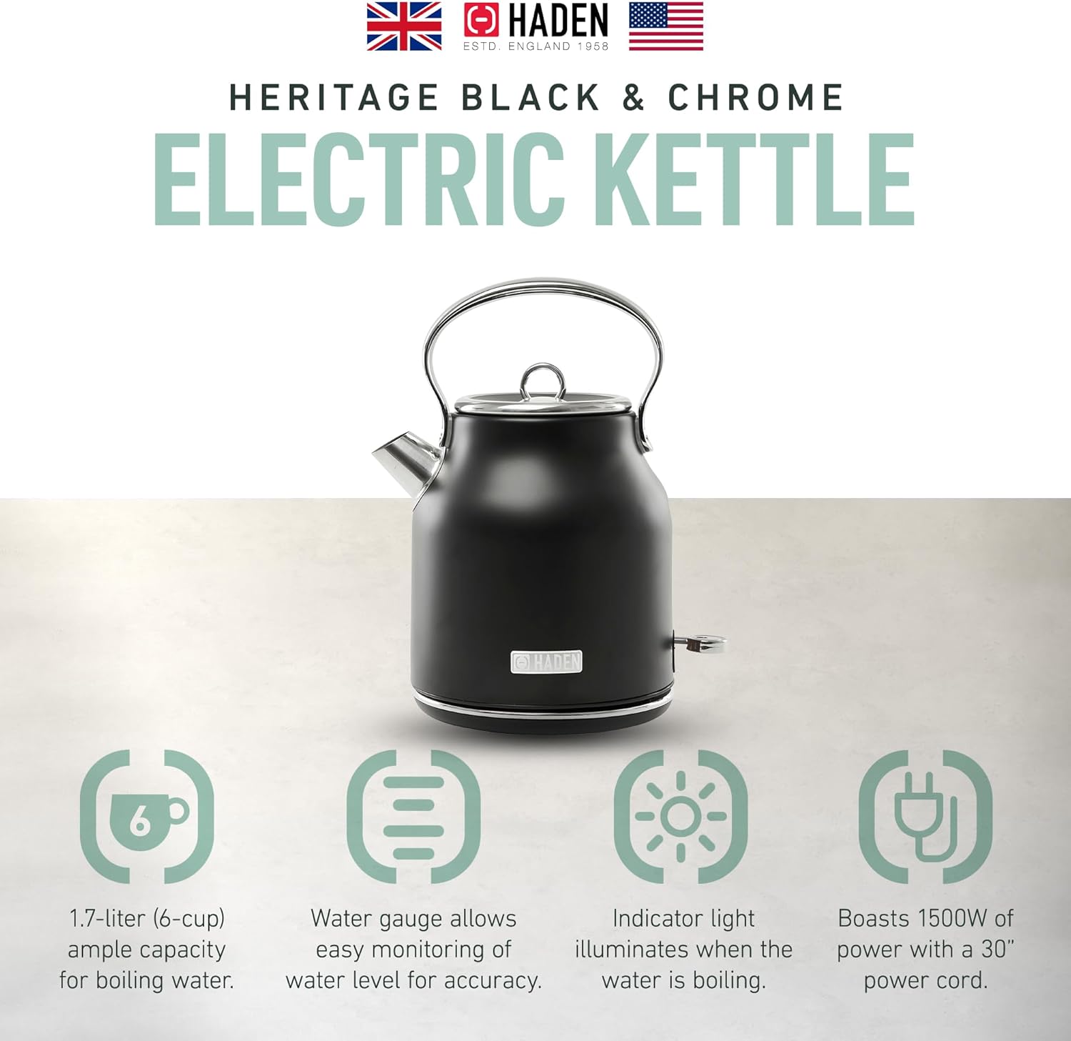 HADEN Heritage 1.7 Liter Stainless Steel Electric Kettle, Hot Water Kettle with 360-Degree Base and Auto Shutoff, Black & Chrome