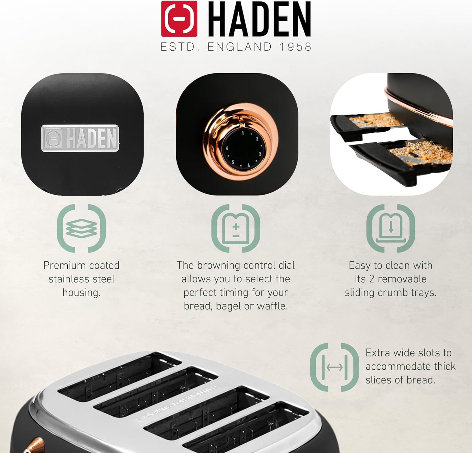 Trusted Since 1958: Offering quintessential British designs, Haden creates elegant home appliances with innovative technology and is trusted by customers as the Go-to British Breakfast Brand. Taking inspiration from British homes, architecture, and landscapes, Haden embodies a perfect balance between form and function