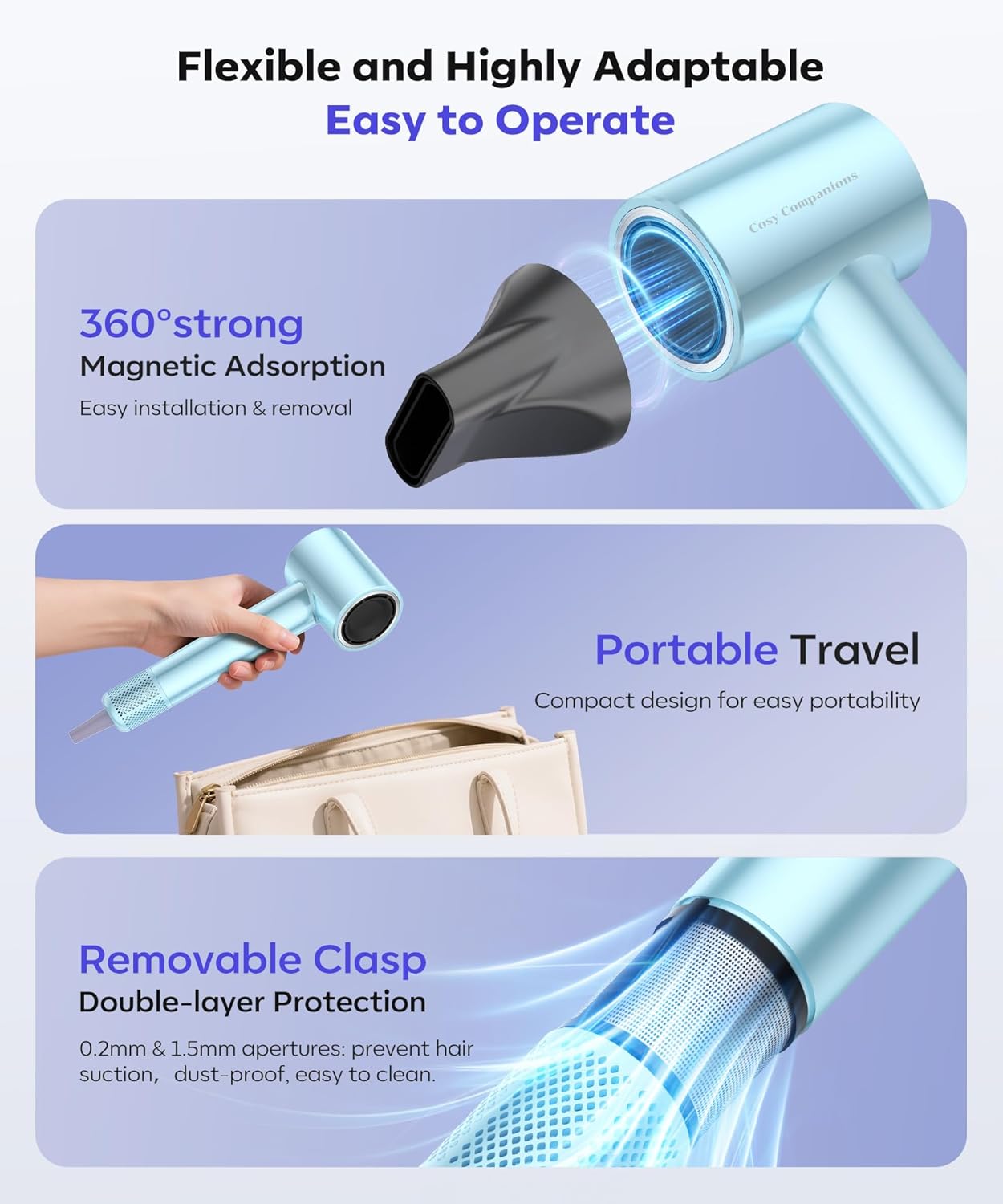 Ultra-Fast Drying: Cosy Companions blow dryer with diffuser equipped with a 130,000 RPM brushless motor, delivering 32 m/s high-velocity airflow to dry hair 5x faster (1-5 minutes) while locking in hair’s natural moisture, making it perfect for thick, curly, or damaged hair