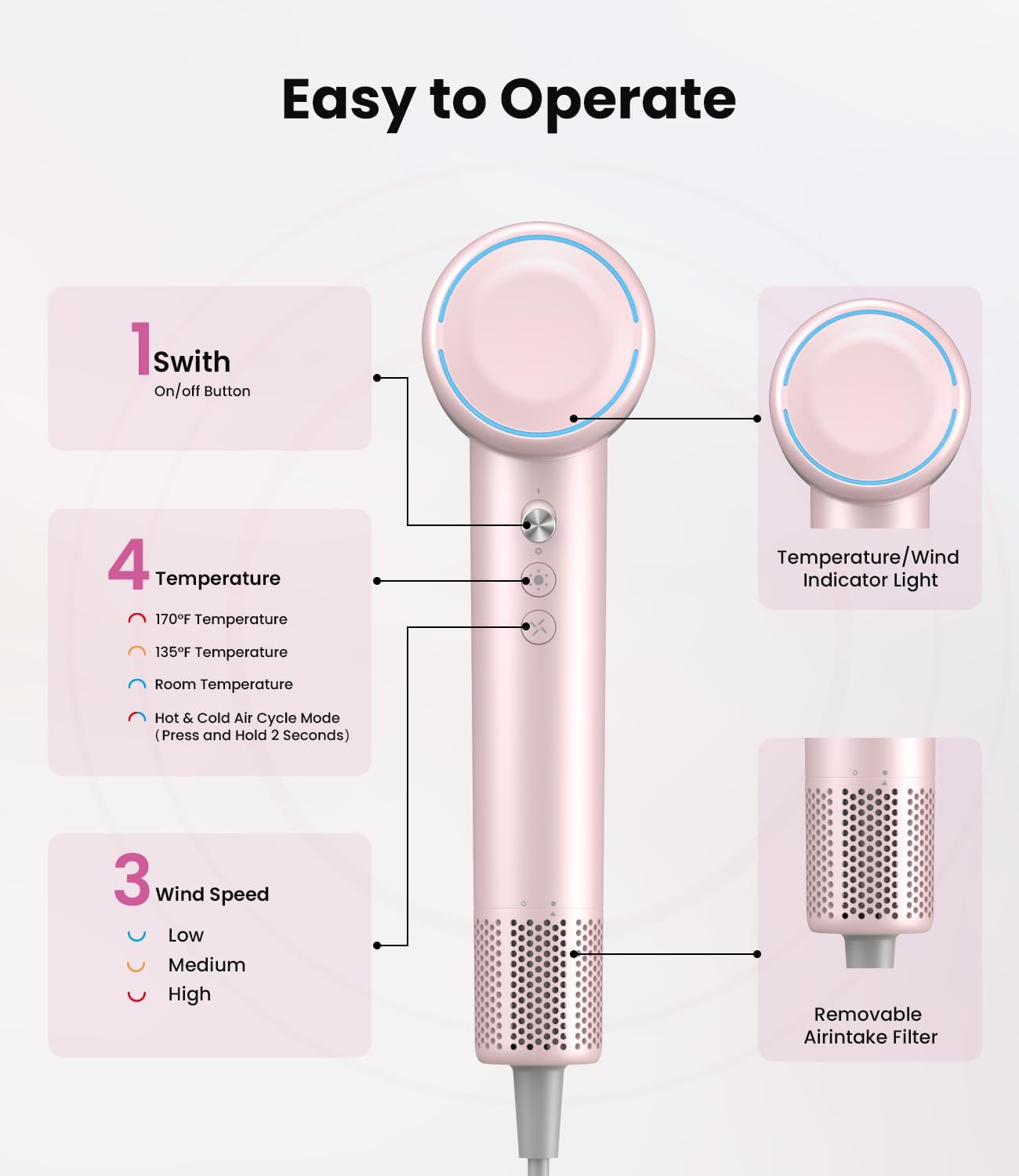 [Fully Customizable: 4 Temp & 3 Speed Modes]: Tailor your drying experience with 4 temperature settings (room temperature, 135F°, 170F° and hot&cold cycle mode) and 3 airflow speeds (low, medium, high). The professional hair dryer allows for precise adjustments to heat and airflow, catering to your specific styling needs.Equipped with a reverse dust removal function. Only need to press and hold the wind speed button for 5 seconds at low speed to trigger this function.