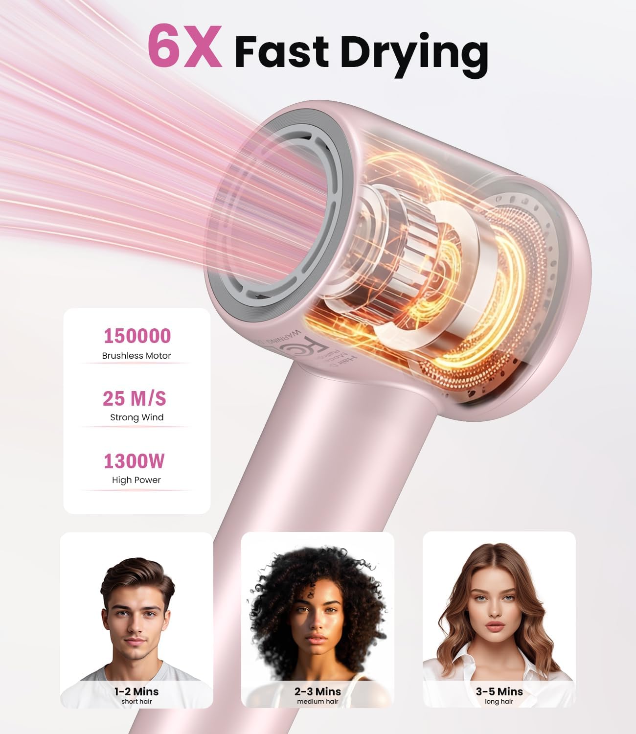 Hair Dryer,150000 RPM Blow Dryer with 500M Negative Ions, Lightweight Ionic Travel Hair Dryer with Magnetic Diffuser & Nozzle for Fast Drying, Low Noise Brushless Motor for Salon & Home Use,Pink