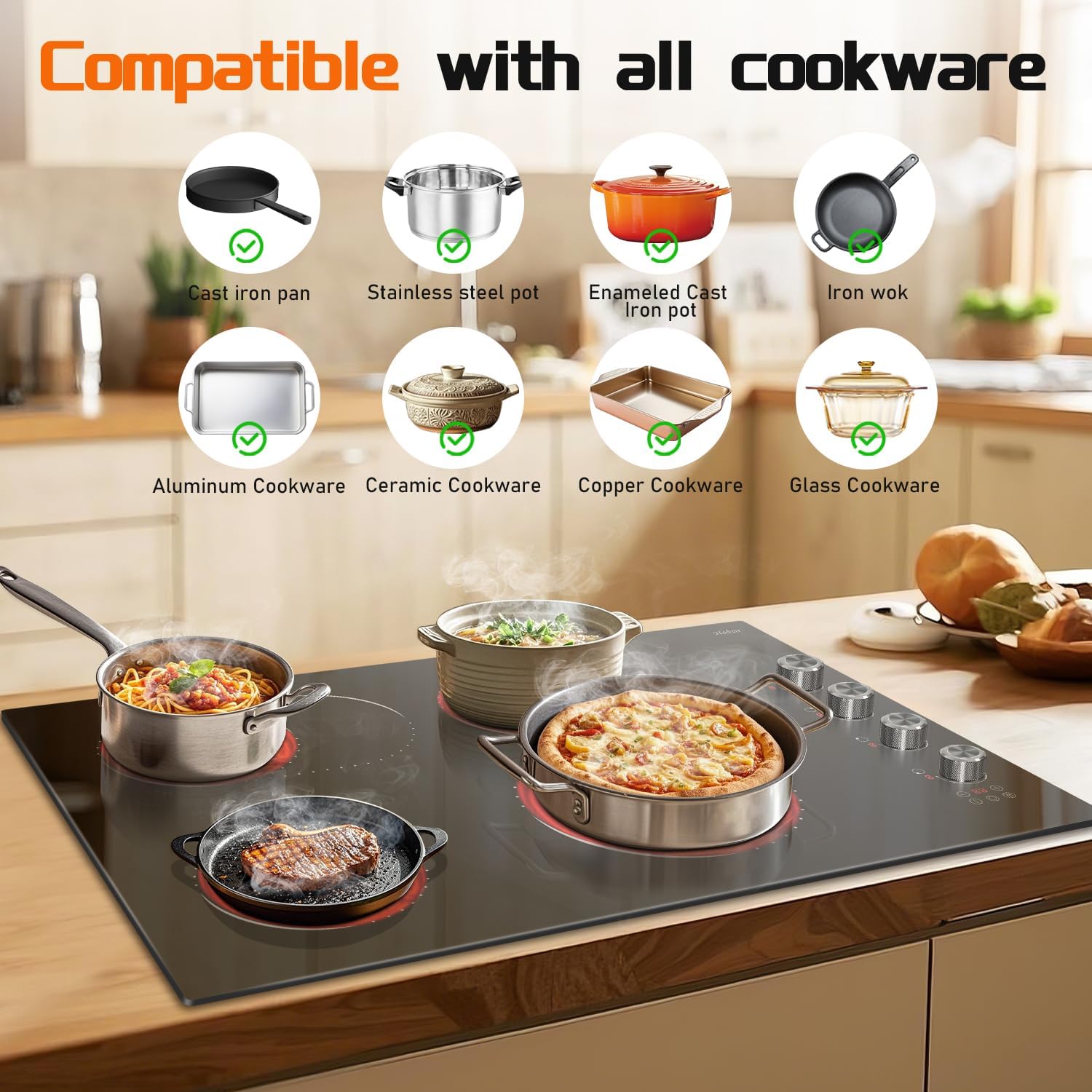🍳 Fits Pans, Crowds & Tiny Apartments: Works with 99% of cookware—yes, even your hipster copper mug. 30-inch electric stove top slides into your kitchen counters but handles 12-person paella parties. Easy-clean glass? Spills wipe faster than you can say “oops.”