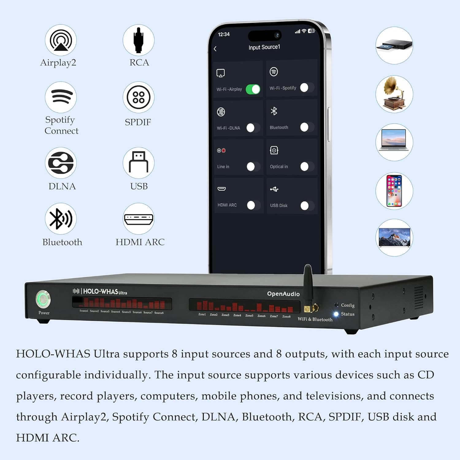 HOLOWHAS Ultra:960W (60Wx 16) | 8 Streams 8 Zones Multi-Room Amplifier |RCA, HDMI ARC, SPDIF |Bluetooth | EQ | USB Disk | Airplay 2, Spotify, DLNA | HoloHome App | BLE Configure| Line Out,SPDIF