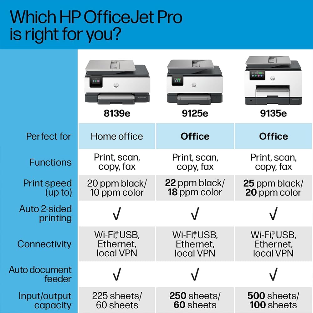 The HP OfficeJet Pro 9125e is perfect for offices printing professional-quality color documents like presentations, brochures and flyers. Print speeds up to 18 ppm color, 22 ppm black.