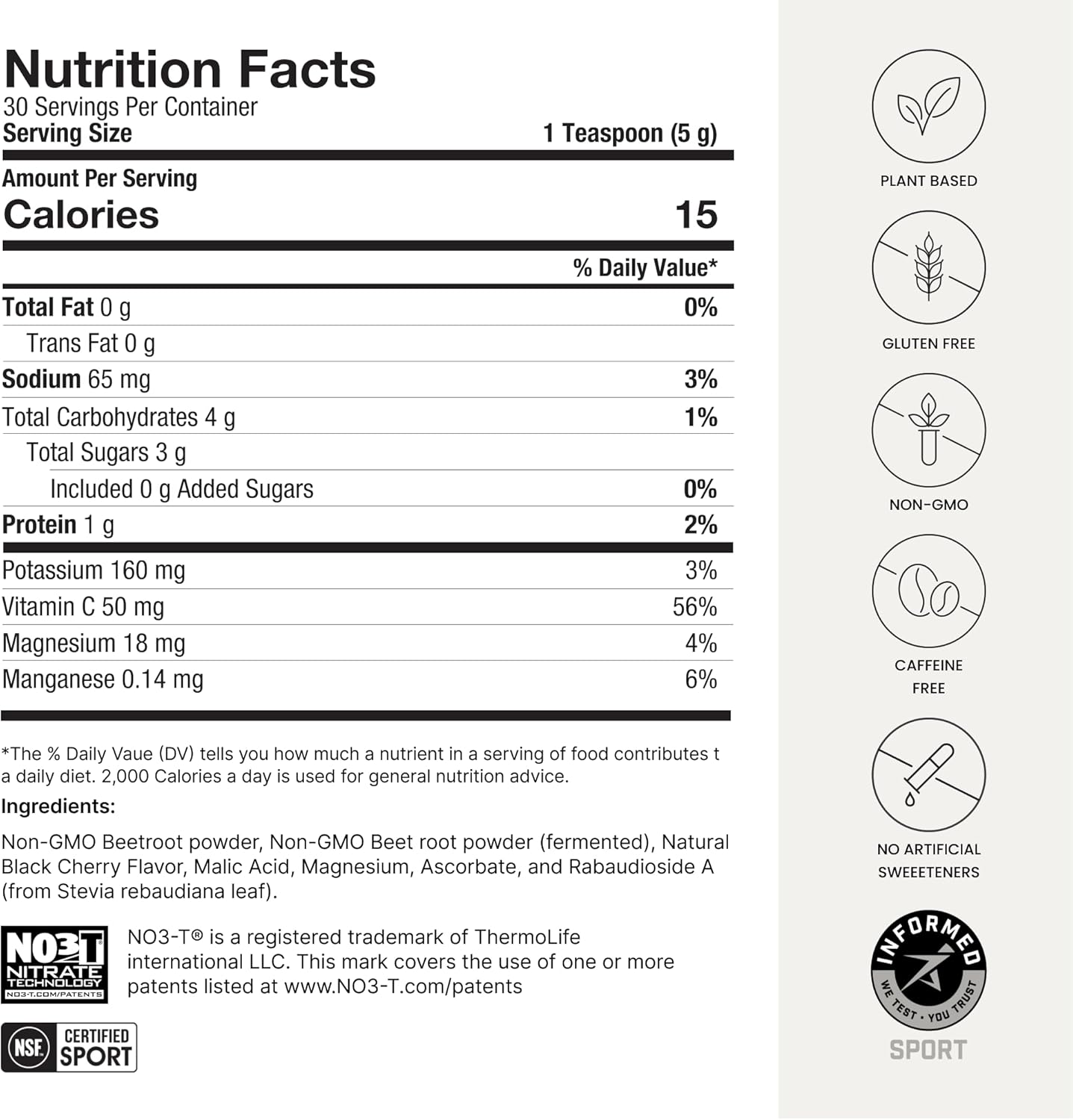 Caffeine free, creatine & stimulant free, 100% non-GMO, plant-based pre workout powder for men and women. SuperBeets Sport is NSF Certified for Sport and Informed-Sport Certified, making it a clean and safe pre-workout option without adulteration.