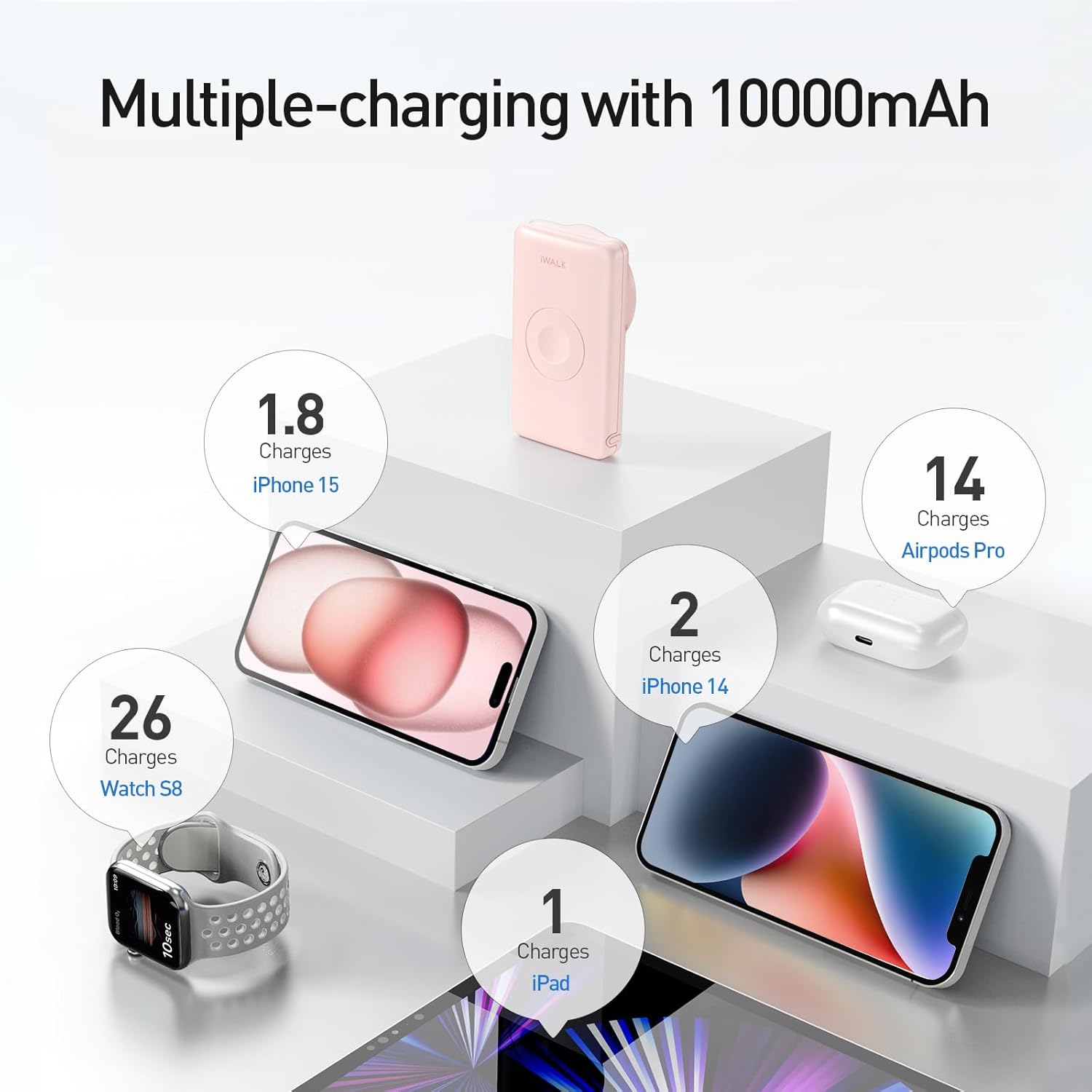 10000 mAh High-Capacity: Fully recharge your Apple Watch up to 22 times, Airpods 26 charges, iPhone 14 about twice and get up to an additional 34 hours of video playback.