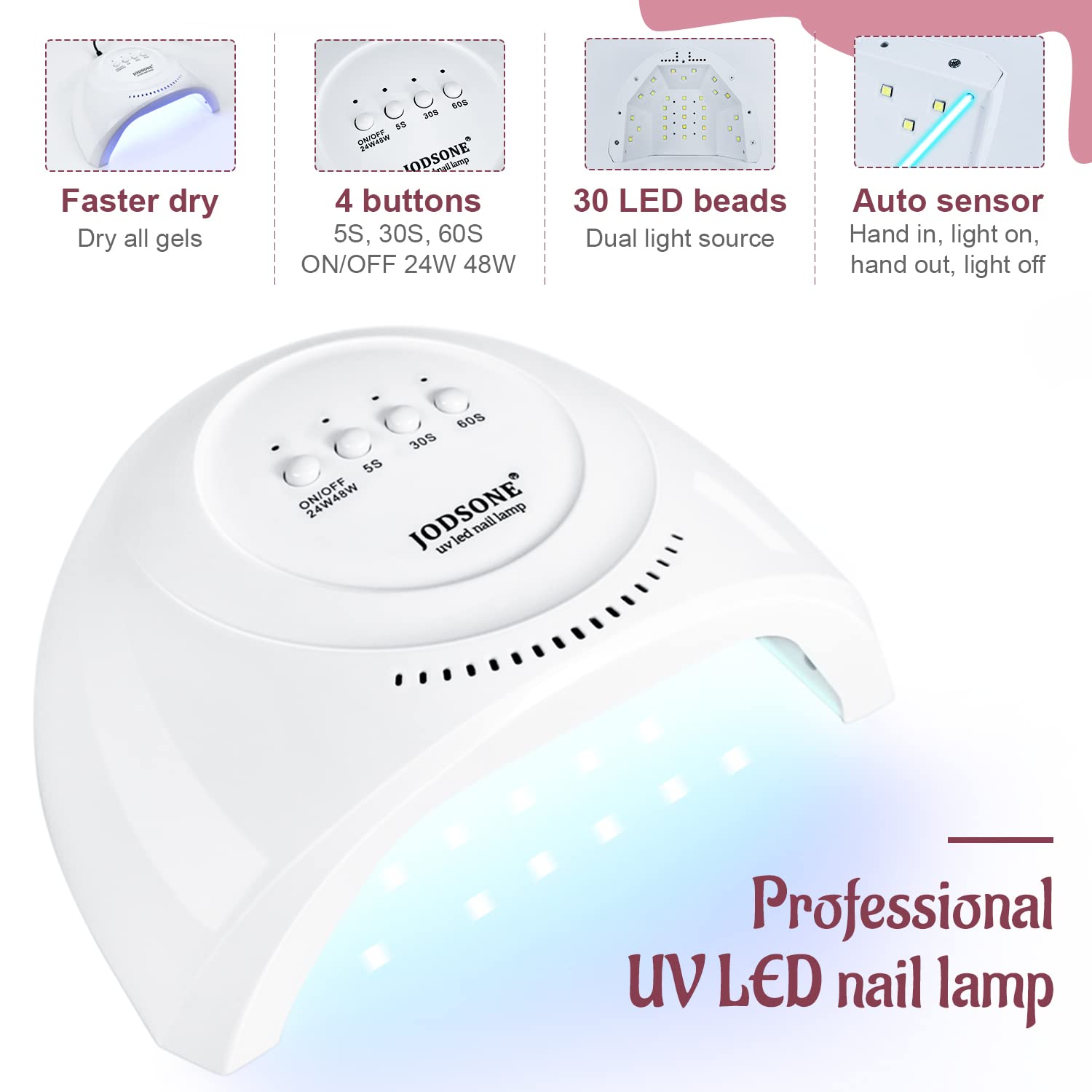 Fast Curing Nail Lamp: This manicure lamp has three cure modes, namely 5S, 30S and 60S. Generally, the cure mode can be selected according to the dosage of gel nail polish, or according to your own suitable mode.