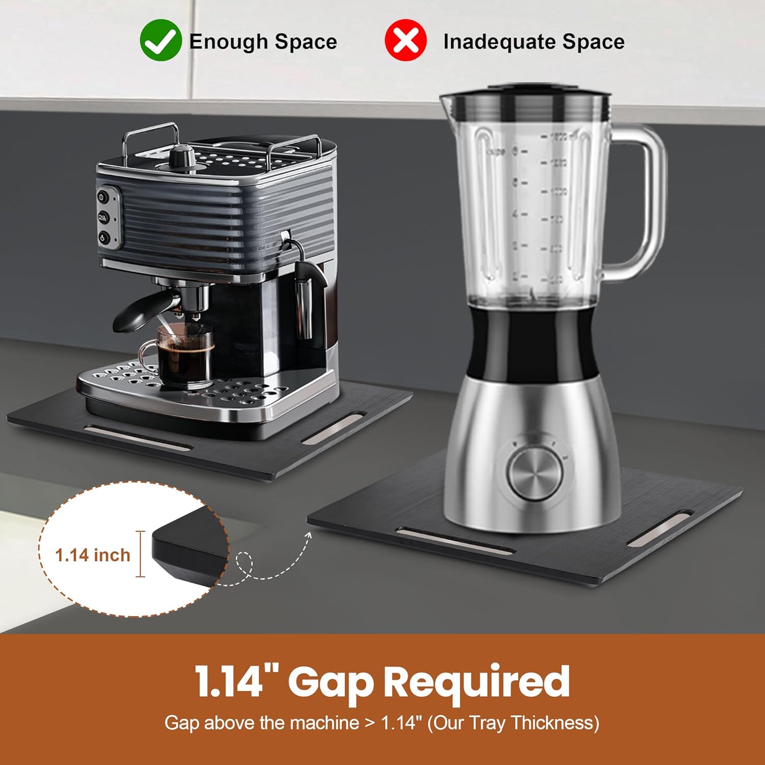 Easy to Use: No installation needed. Rubber rolling wheels ensure your countertop sliding tray move smoothly on marble, wood and other surfaces in any direction, protecting your countertops. Note: The tray is 1.14″ tall. Make sure your appliance and cabinet clearance exceed 1.14″