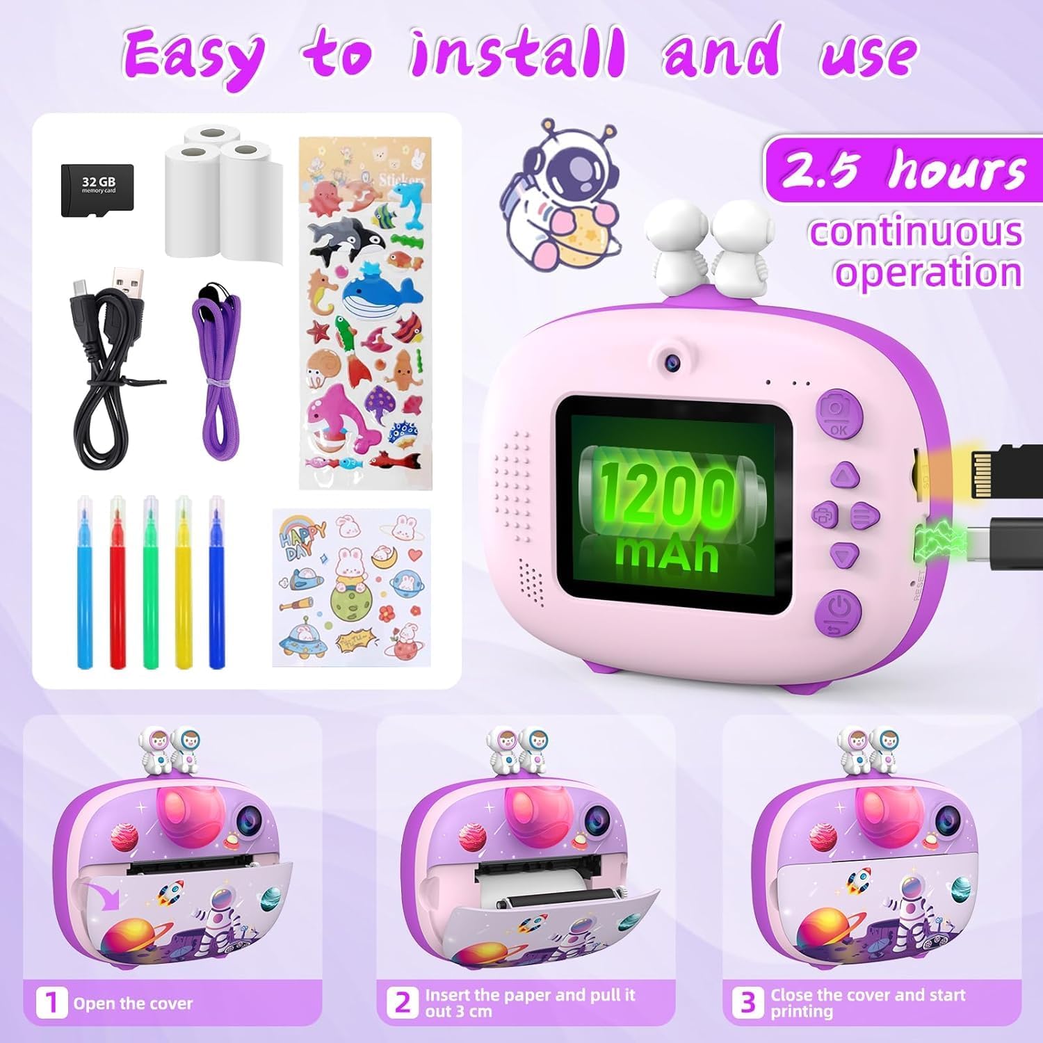 MULTIFUNCTIONAL CAMERA: This kids digital camera has it all! With functions like instant printing, 1080P video,digital zoom, time-lapse photography, continuous shooting,filter, frames, kids can explore their creativity and enjoy hours of fun