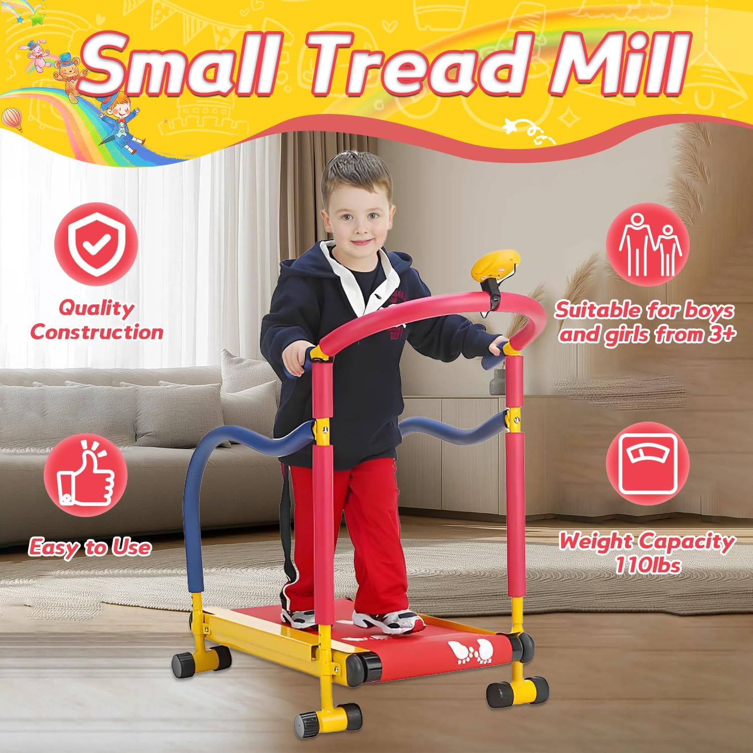 HOME EXERCISE EQUIPMENT: Engineered with powder-coated iron frame construction supporting 110lbs capacity, this heavy-duty kids treadmill ensures lasting durability across childhood growth stages. The reinforced base structure with anti-slip rubber feet, making it reliable family fitness equipment for daily use that grows with your kids physical development needs.