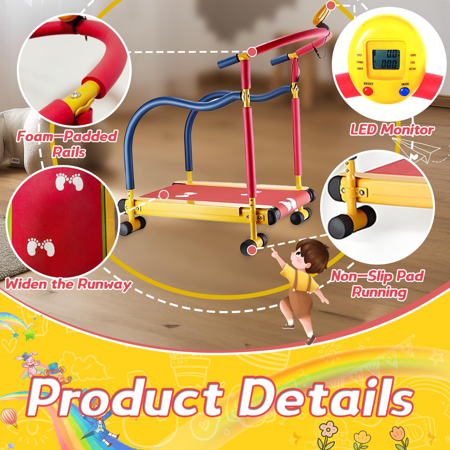 SAFE & MOTOR-FREE KIDS FITNESS EQUIPMENT: Featuring a self-propelled manual treadmill design with foam-padded safety rails, this kids-friendly exercise machine eliminates electrical hazards while encouraging physical activity. Perfect as toddler workout equipment for ages 3+, the textured EVA running deck and ergonomic handlebar promote proper posture development, making it ideal for creating healthy exercise habits through safe indoor playtime engagement.