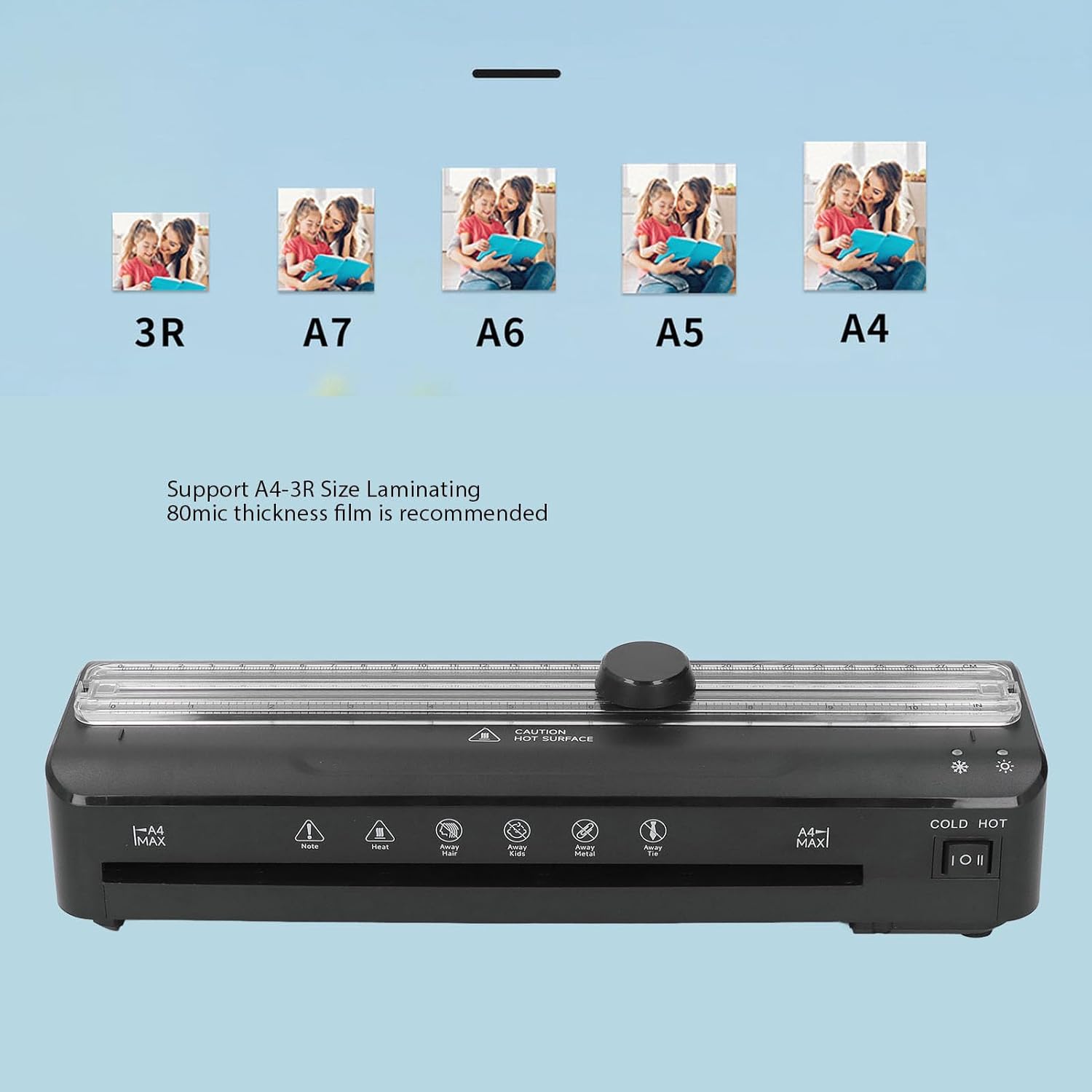 Compatibility: Suitable for a wide range of sizes from A4 to 3R, making it suitable for laminating photos, menus, documents, certificates, drawings, and more, catering to diverse office needs