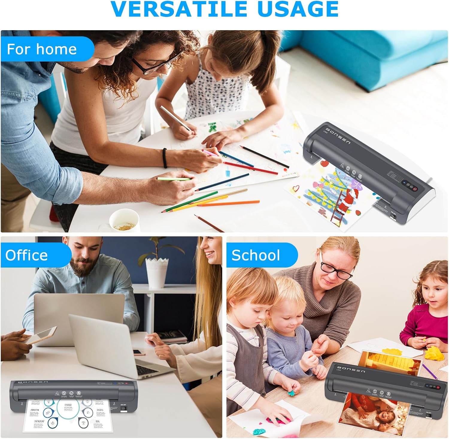 Patented Anti-Jam Technology: The BONSEN laminator machine features a Jam-Free design, incorporating pressure plates between the rollers to prevent pouches from jamming, ensuring your items remain smooth and flat without wrinkles or curls