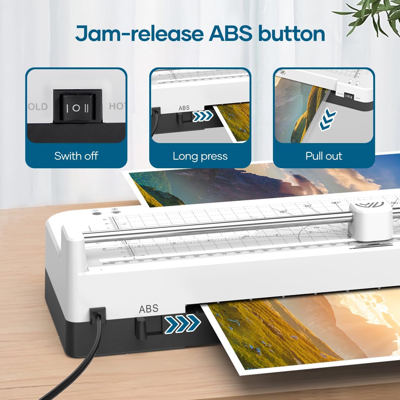 【100% Never Paper Jam Laminators】lamination machine features a quick-release ABS button. If paper jams, just turn off the laminator and press the ABS button, then pull out the paper from the laminator. It can safeguard your important documents.Say goodbye to paper jams easily from now.