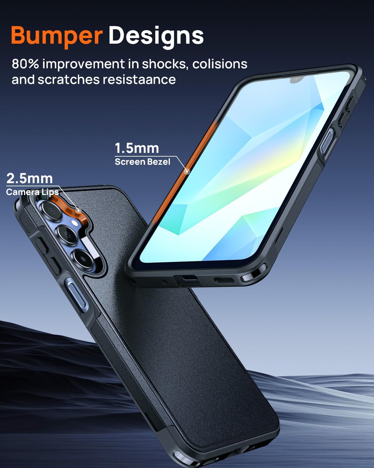 Perimeter Bumper Designs: Each camera lens is fully surrounded and protected by 360°. A 1.5mm (0.06 inch) raised bezel on the screen and 2.0mm (0.08 inch) on the camera lens can prevent everyday scratches when you place the phone face down.