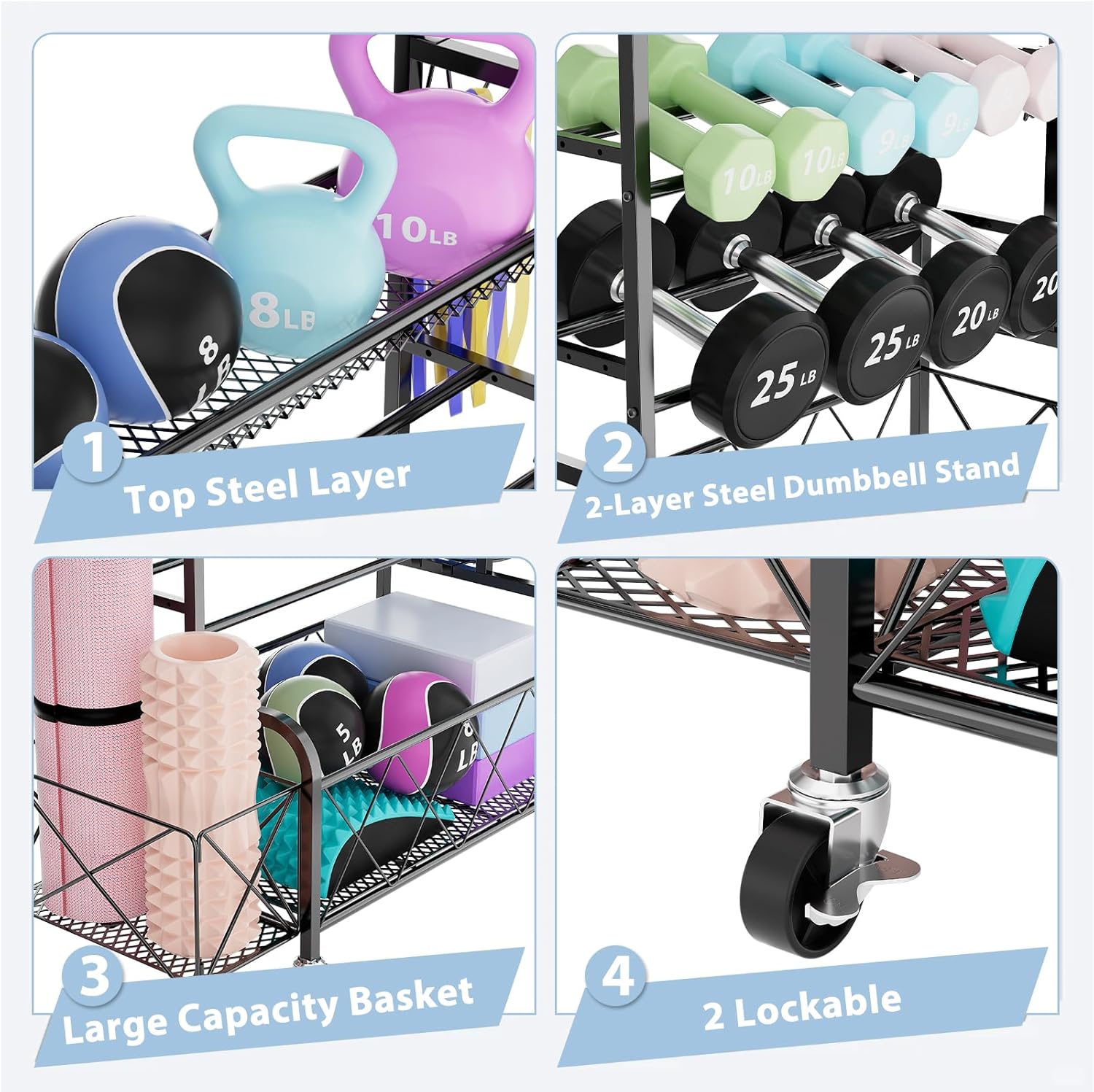 Large Weight Rack for Dumbbells,4 Tier Weight Rack for Home Gym,Sturdy Home Gym Storage Dumbbell Rack for Kettlebells Yoga Mat and Balls,Heavy Duty Weight Stand for Dumbbells with Wheels and Hooks
