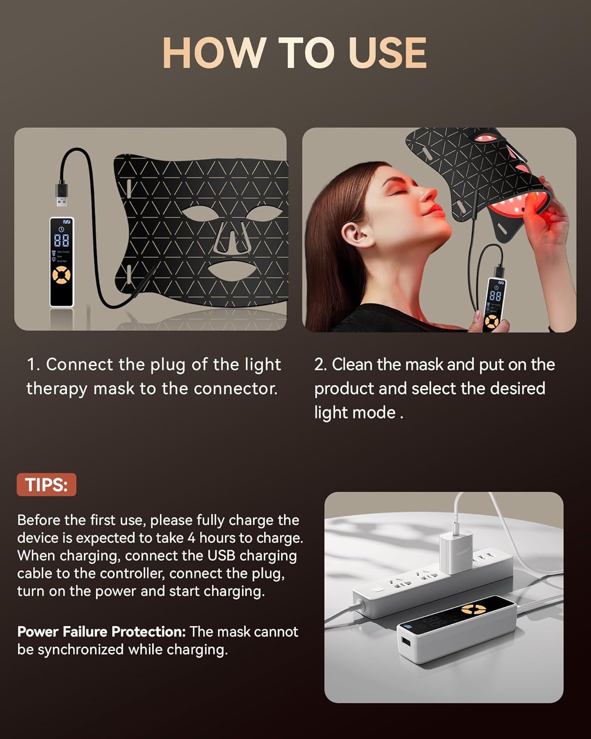 ❤️【Simple operation】: The plug of the light therapy mask and the connector to link that is to choose the desired light mode can be used! Before first use, please fully charge the device – estimated charging time is 4 hours!