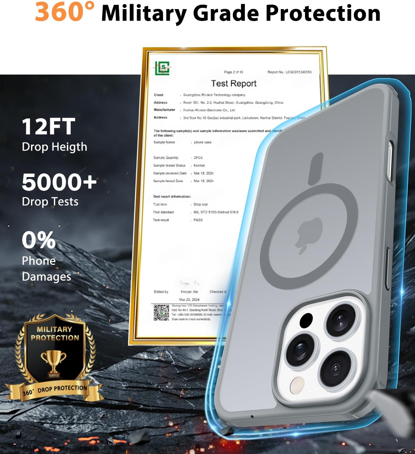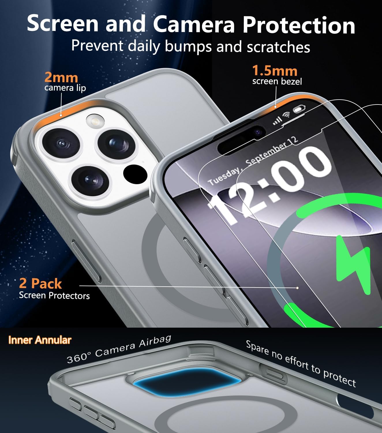 【360° Protection and Shockproof】Passed MIL-STD-810H Military grade protection standard. The iPhone 16 Pro Max MagSafe case features shock-absorbing materials, the double-cushioned structure and airbag cushions absorbs a whopping 99% of impact force during drops. The four shock-absorbing corners can 360° Protect your phone against everyday drops and bumps