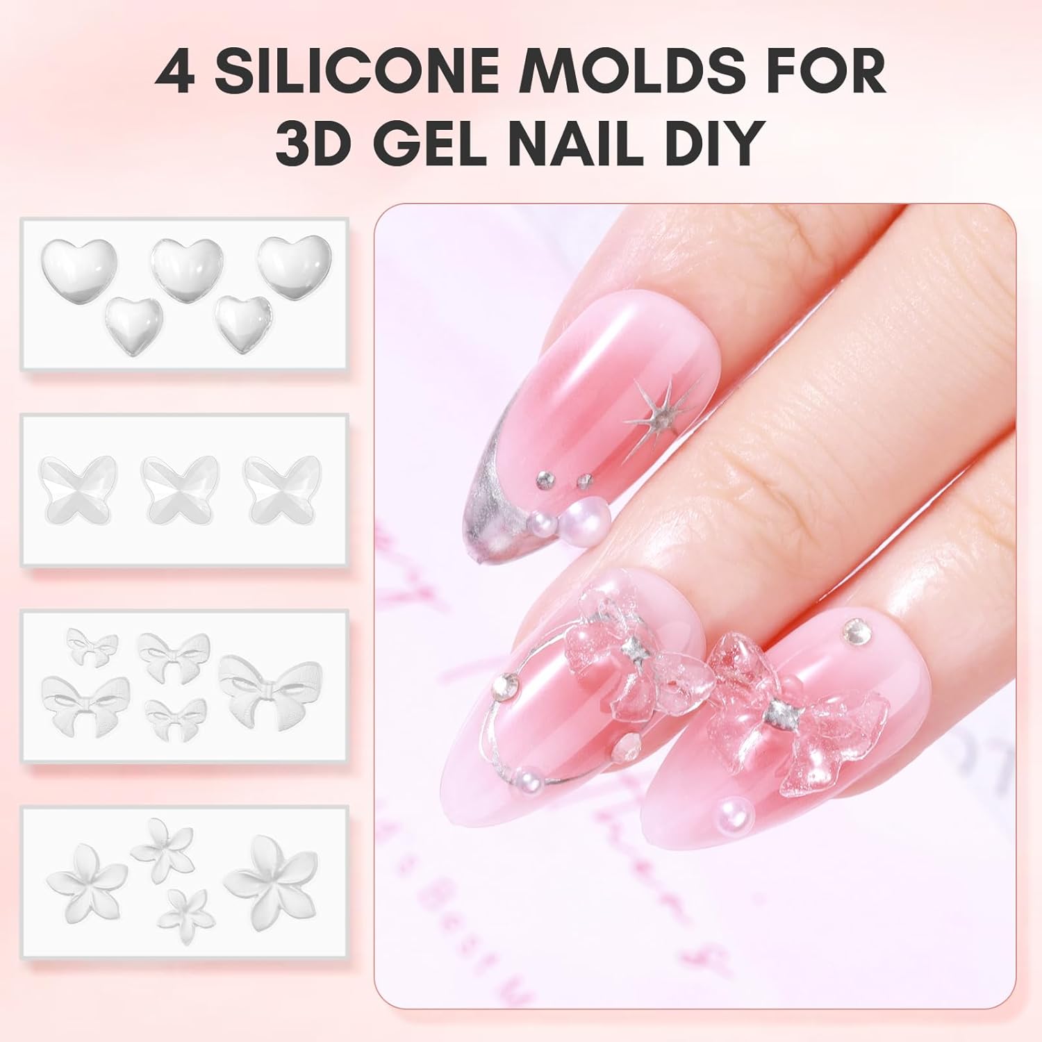 Sculpture Gel Builder Starter Kit–This package comes with 15ML solid builder gel for nails; 4 silicone nail molds with love heart,flowers and butterfly patterns for 3d nail decoration DIY,and a dual end silicone nail sculpting pen tool