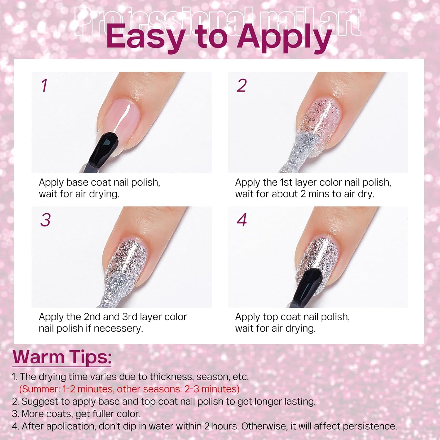 Warm Tips: Apply air dry nail polish in thin layer for each coat, make it completely dry before applying the next, ensuring long-lasting, no drop-off results. The item is oil-based nail polish, there is a little odor. Avoid any water for 2 hours after applying the polish.
