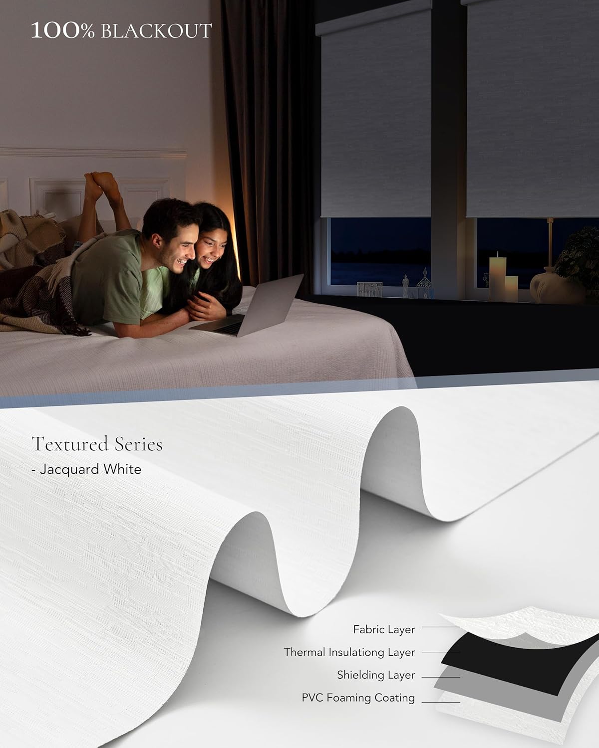 [100% BLACKOUT FABRIC] provides total room darkening and insulation, helping to conserve energy, protect your privacy, and block UV rays. It’s also easy to clean. The cordless design is safe for children and pets, making it ideal for living rooms, bedrooms, bathrooms, kitchens, media rooms, and offices