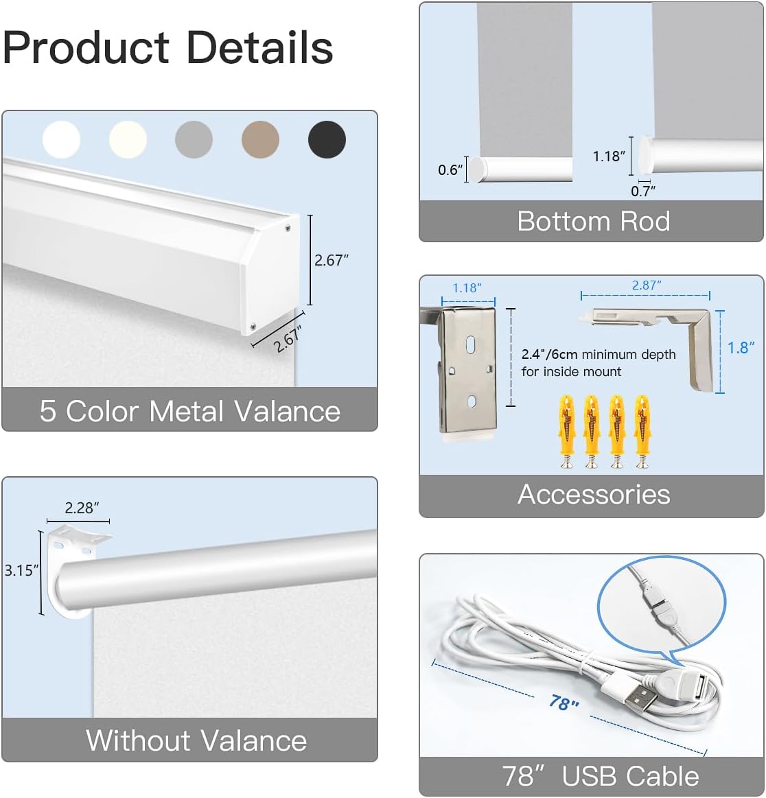 Material: 10O% blackout polyester fabric, provides room darkening environment. The front side is pure fabric, back side is foaming coating fabric. Blackout motorized shades can keep energy, reduce noise, keep privacy, and protect from UV rays. The cordless design provides a child/pet-saving environment. Suitable for living room, bedroom, kids’ room, home office, media room, office, etc. Indoor use only.