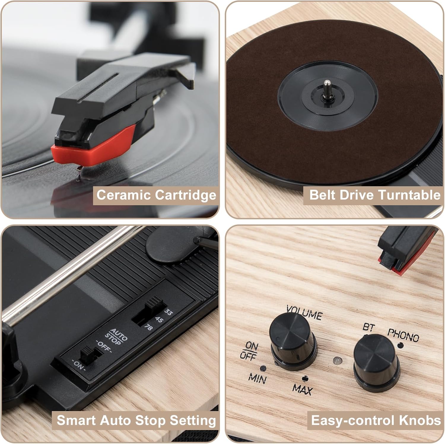 3-speed belt drive: Vinyl is back, and with it comes the highly sought-after nostalgic sound. It plays 33⅓, 45, and 78 RPMs without skipping and maintains the integrity of all vinyl records. Auto-stop setting makes it possible to stop automatically when it reaches the end of the record.
