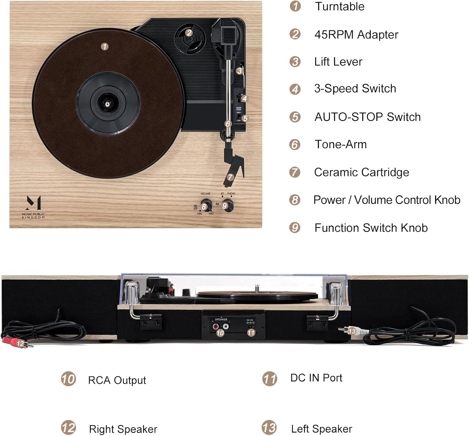 Our Bluetooth Record Players for Vinyl with Speakers are excellent gift choice for birthday or Christmas, especially for a music lover. With the MPK record player turntable, you can play both 33 1/3 and 45 RPM,78 RPM(7″, 10″& 12″ vinyls) records easily. With its built-in switchable Phono Preamp, the turntable record player also can play other devices’ music by wireless Bluetooth. For better or louder sound, connect external speaker via RCA cable. Let you enjoy clear and natural sound.