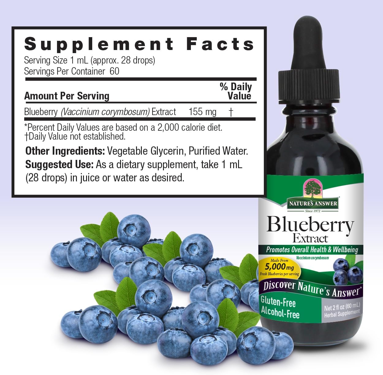 Nature’s Answer Blueberry Fruit Extract brings you the best of the Blueberry. Alcohol Free and Gluten-Free, this highly concentrated 1,000 mg extract gives you the antioxidant power you need
