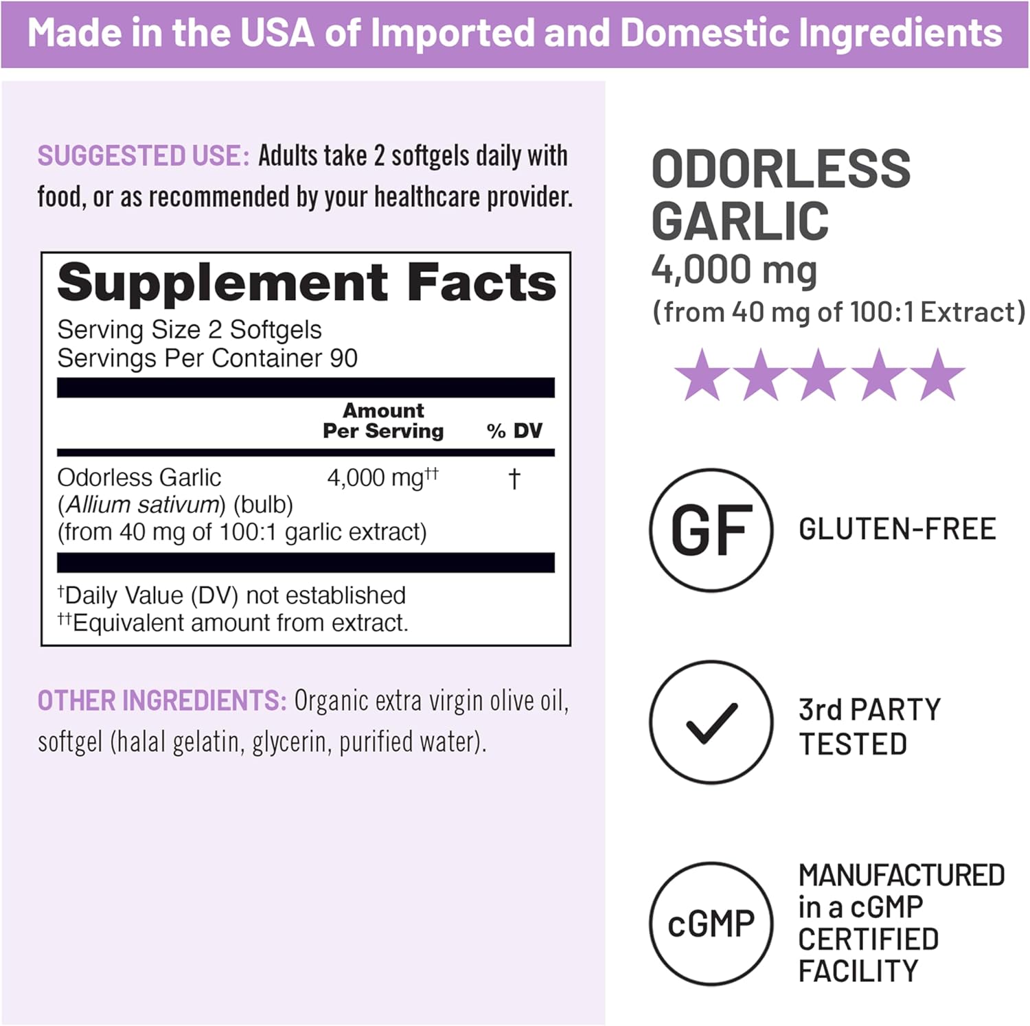 NatureWise Odorless Garlic Supplement 4000mg – Ultra Potent 100:1 Extract – Healthy Cholesterol Formula, Heart Health Support – Non-GMO, Gluten Free, with Halal Gelatin – 180 Count[90-Day Supply]