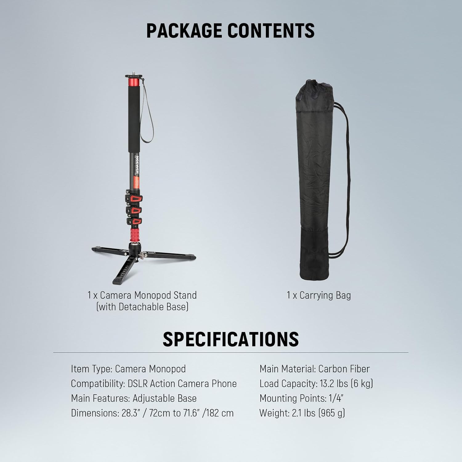 NEEWER 71.6″ Camera Monopod Stand, Lightweight Carbon Fiber Travel Tripod with Detachable Base for DSLR Camcorder Video Recording, Telescopic Selfie Stick Trekking Pole, Max Load 13.2lb, TP71