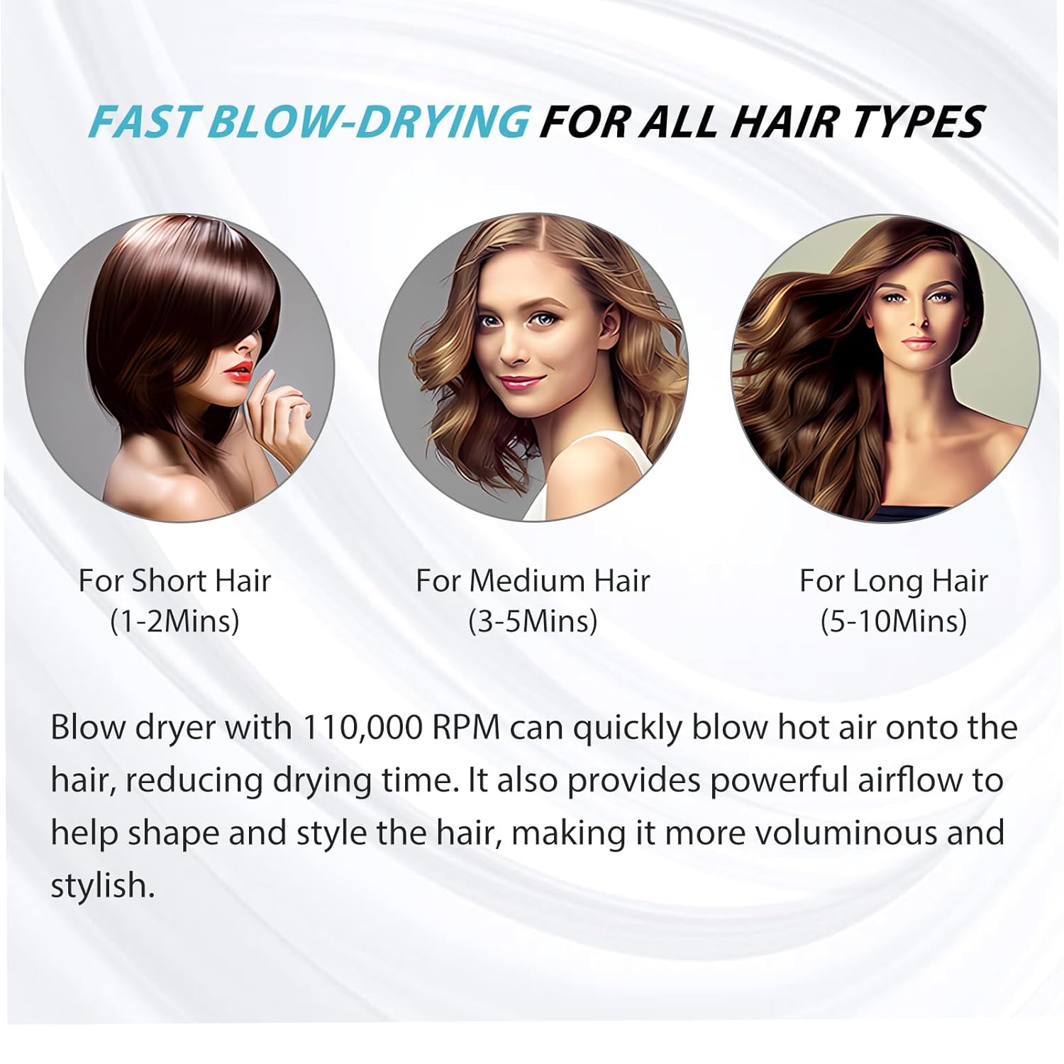 [High-speed brushless motor] Nicebay high-speed professional hair dryer is equipped with 1600W power and 110000RPM high-speed brushless motor, which can make the wind speed up to 22m/s and dry your hair faster