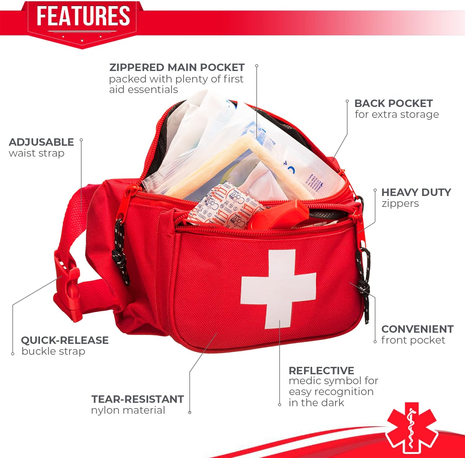 FUNCTIONAL DESIGN – The Hip Pack features a reflective medical symbol for easy identification of the rescuer/lifeguard to a swimmer in distress, and for easy recognition in the dark.