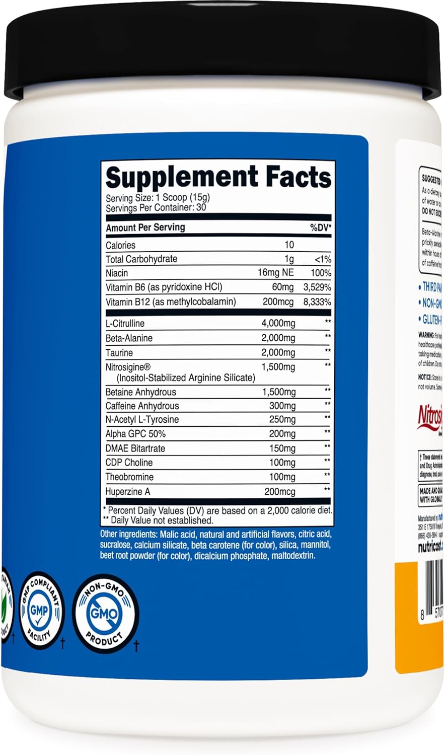 Nutricost Pre-Workout Powder Contains L-Citrulline Malate 2:1, Beta Alanine, Taurine, Agmatine Sulfate, L-Tyrosine, L-Theanine, Caffeine Anhydrous, Theobromine, Huperzine A, Thiamin, Niacin, Vitamin B6, and Vitamin B12