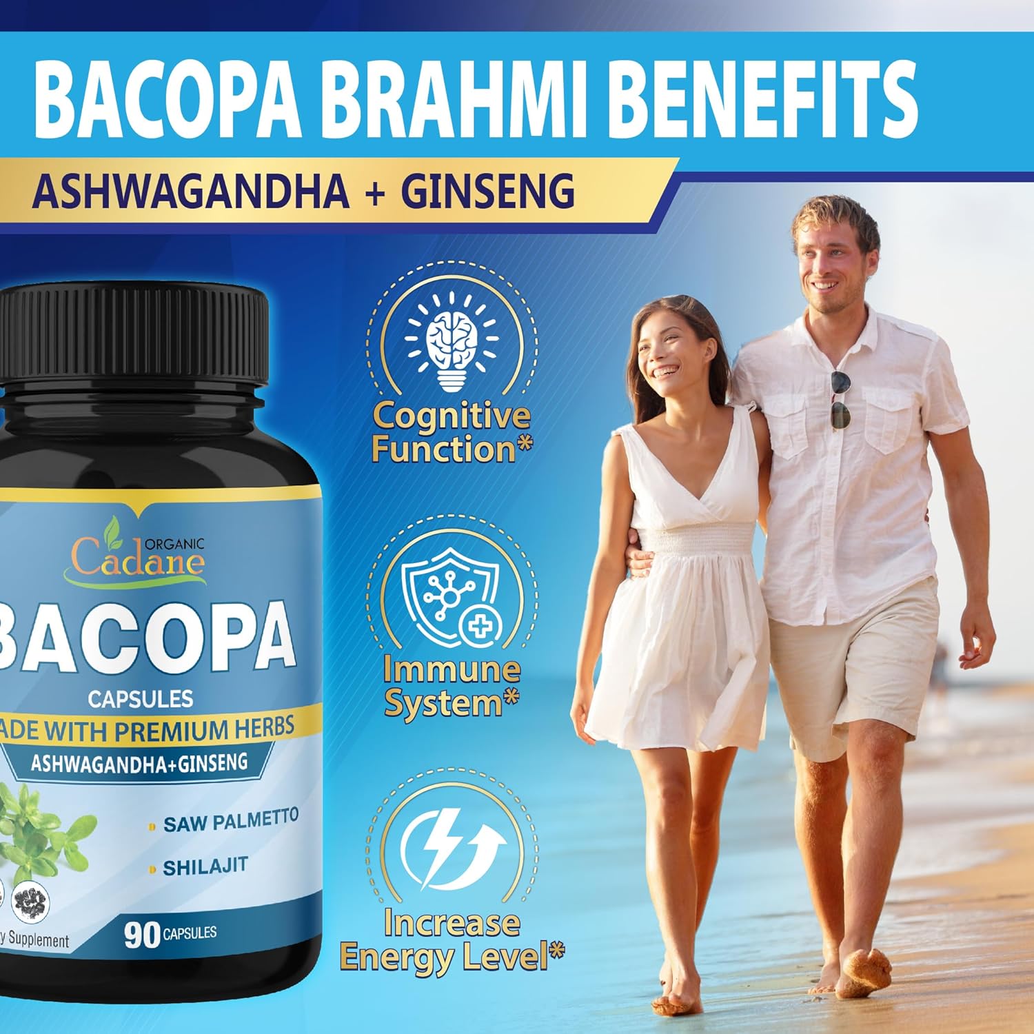 Organic Cadane Bacopa Monnieri Supplement – Blended with Ashwgandha, Ginseng, Saw Palmetto, Shilajit – 90 Capsules for 3 Month Supply