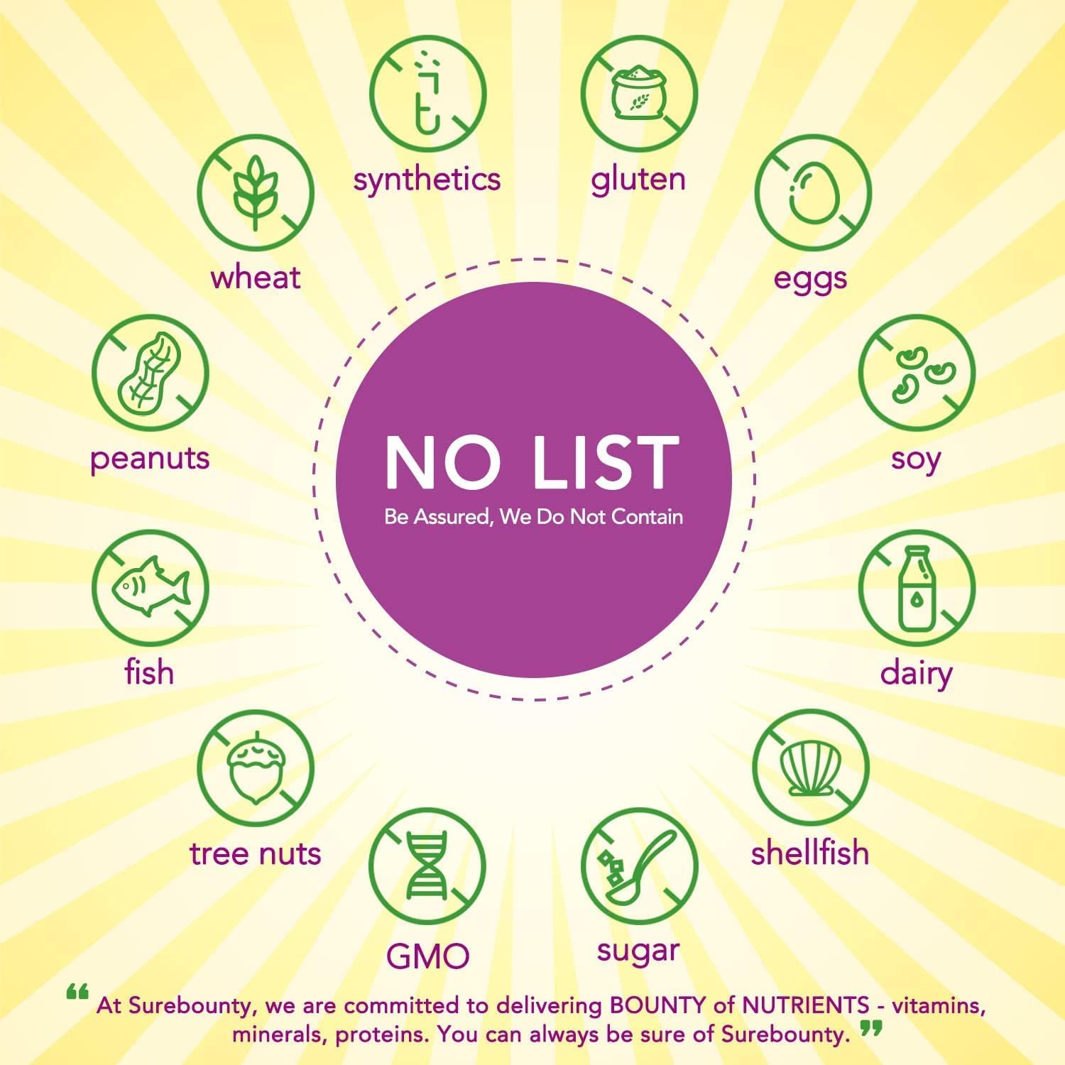 No Allergens or Nasties: Surebounty has always been dedicated to formulating supplements that cater to people from all walks of life and can easily fit into their daily routines. We want you to enjoy the amazing benefits brought by our products without worrying about getting allergic. Be Assured: NO GMOs, soy, gluten, milk, sugar, egg, wheat, corn, nut, fish, shellfish. And never will you find Nasties like artificial ingredients, fillers, binders, or preservatives in Surebounty!