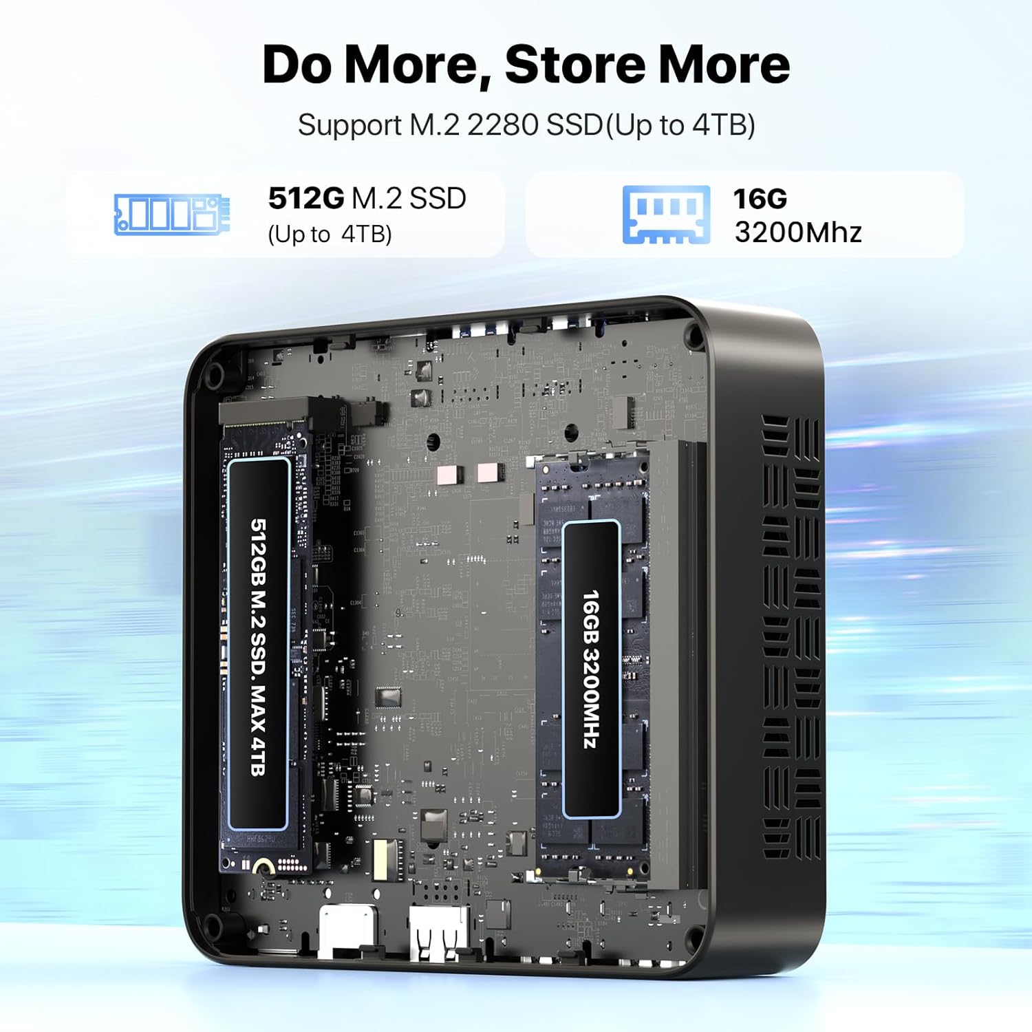 The 13th generation Intel Twin Lake N150, the frequency is as high as 3.6 GHz, which is faster than the Intel N5095, N95 and N100. This mini computer has a significantly faster speed, better performance, and lower power consumption (6W up to 15W), providing high-performance operation for office work, daily tasks and home entertainment.