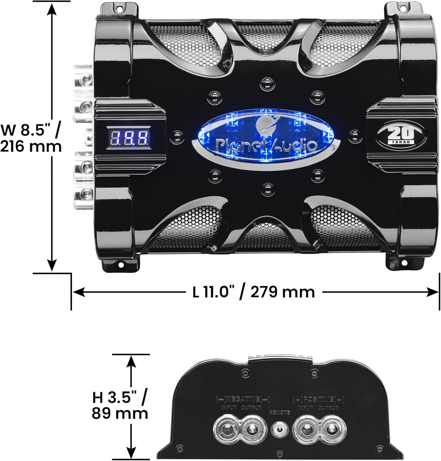Planet Audio PC20F Car Capacitor – 20 Farad, Energy Storage, Enhance Bass from Stereo, Warning Tones, LED Voltage Meter